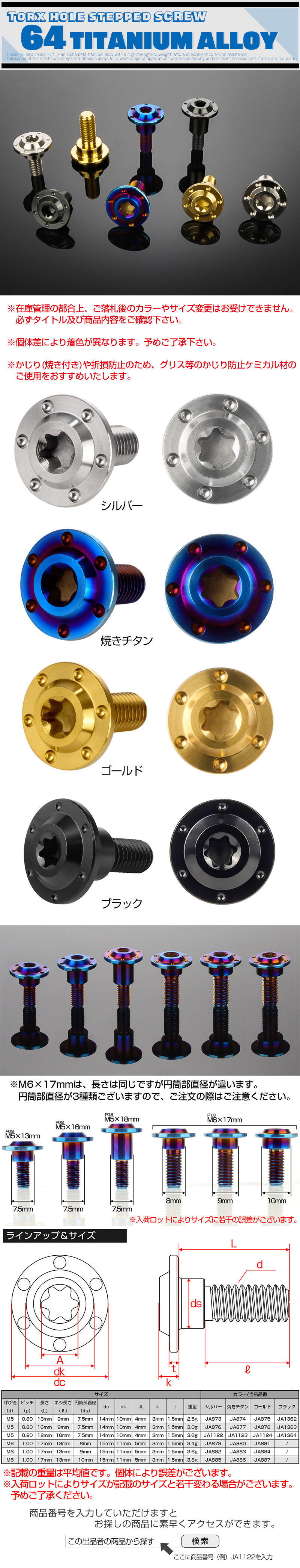 軽量で強度・耐食性・耐熱性に優れた64チタン合金から削り出した、デザインボルトです。 ヘッド部分は多孔加工を施した、独特なデザインになっています。 カムアウト現象の軽減やイタズラ防止目的のトルクス穴を設けた、デザイン性にも機能性にも優れたドレスアップパーツとしてもご使用いただけるボルトです。 ■他のサイズやカラーは⇒ こちら ■その他、チタン製品は⇒ こちら | ■ チタン製 トルクス穴 段付きボルト ■ 商品番号:JA883 ■ 呼び径:M6 ■ ピッチ:1.00 ■ 長さ:17mm(ネジ部:13mm) ■ 円筒部直径:9.0mm ■ 頭部穴形状:T型トルクス ■ 素材:64チタン(Ti-6Al-4V) ■ カラー:焼きチタン ■ 入数:数量1で1本 価格は数量1個の価格です。5本必要な場合はご入札時の数量を5に設定してご入札下さい。 ※チタンはカジリ(焼き付き)を起こしやすい材質です。折損防止のため、グリス等のかじり防止ケミカル材のご使用をお勧めします。 | |
