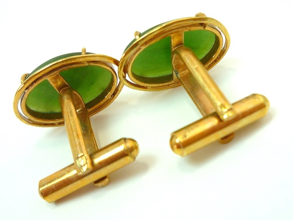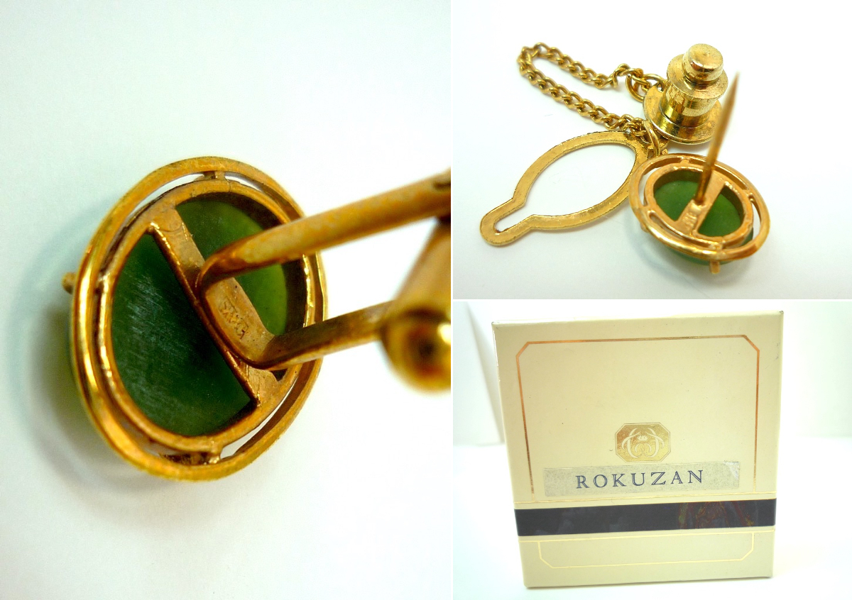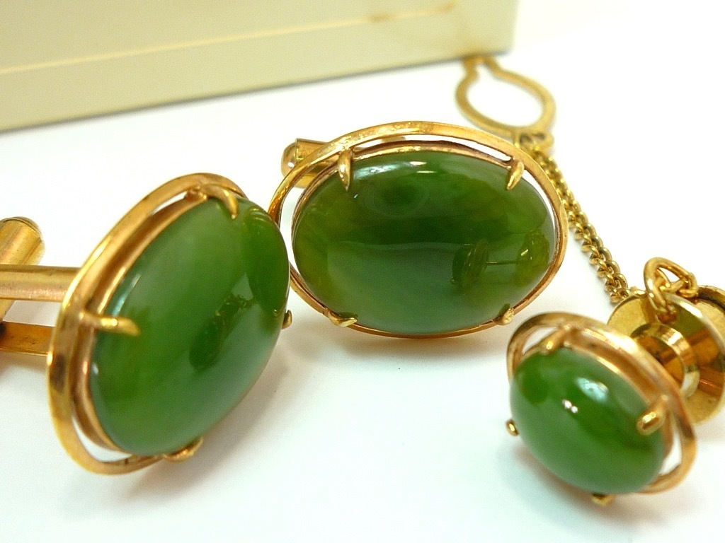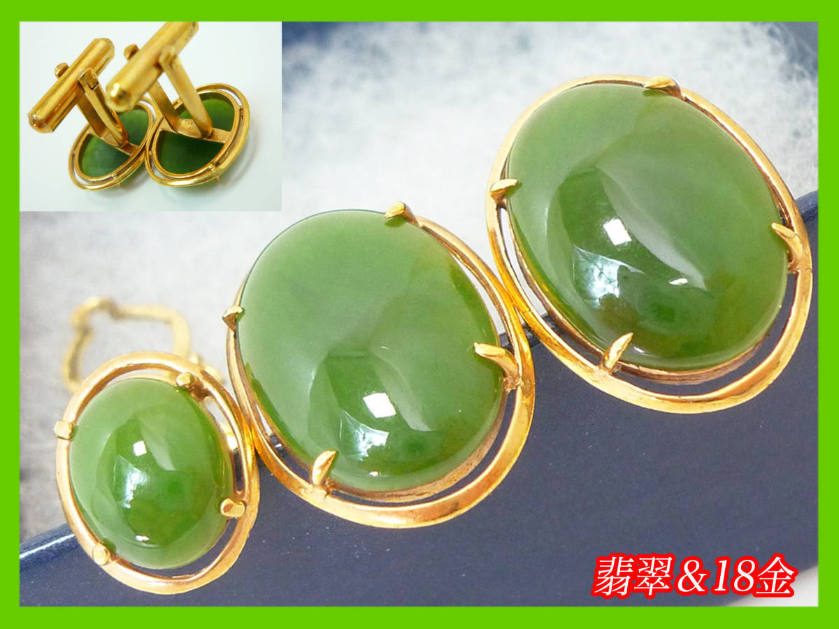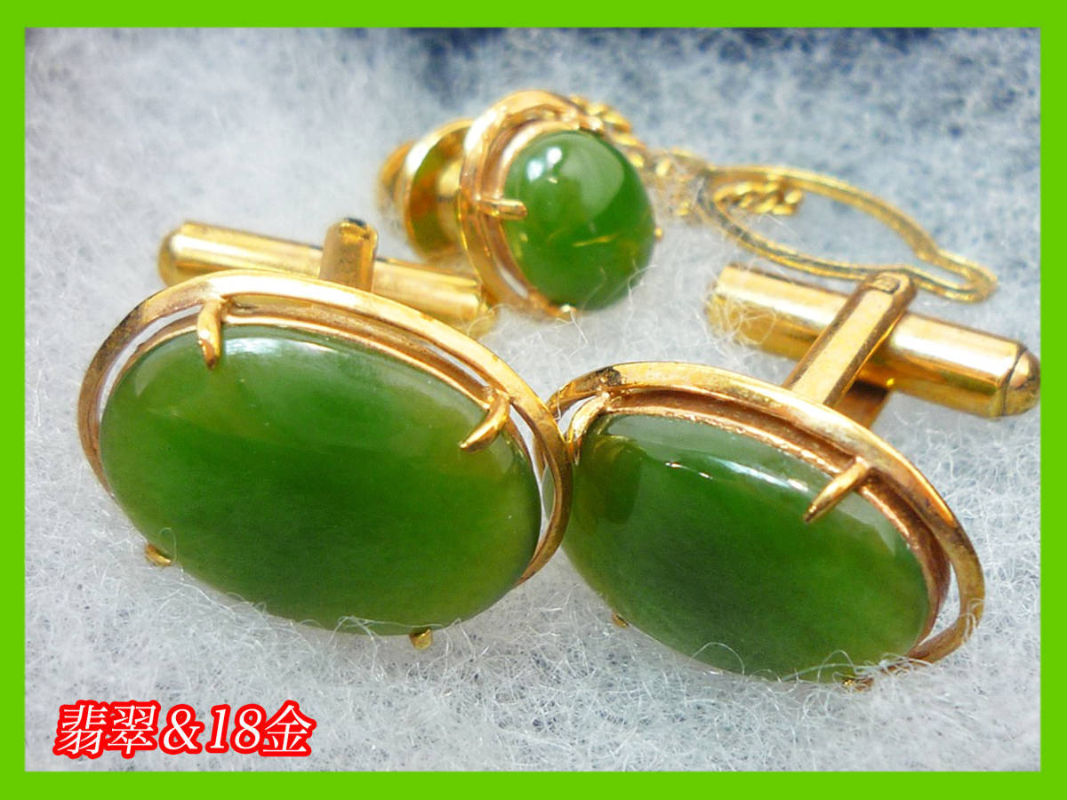 翡翠 ヒスイ&18K 18金 カフス タイピン セット ケース付 刻印 カフリンクス 高級感 豪華 運気UP 繁栄 長寿 幸福 紳士 ギフト 美品 注目
