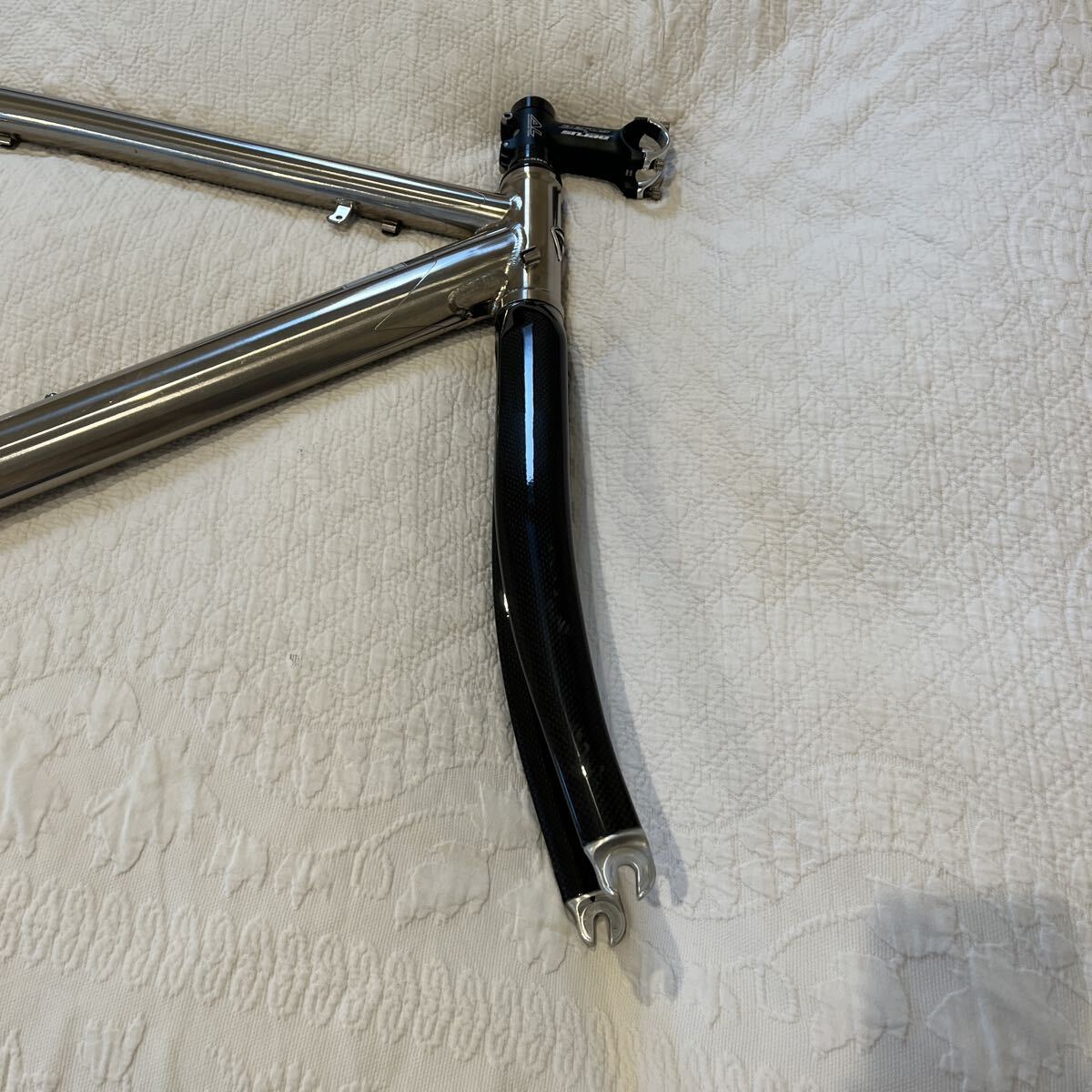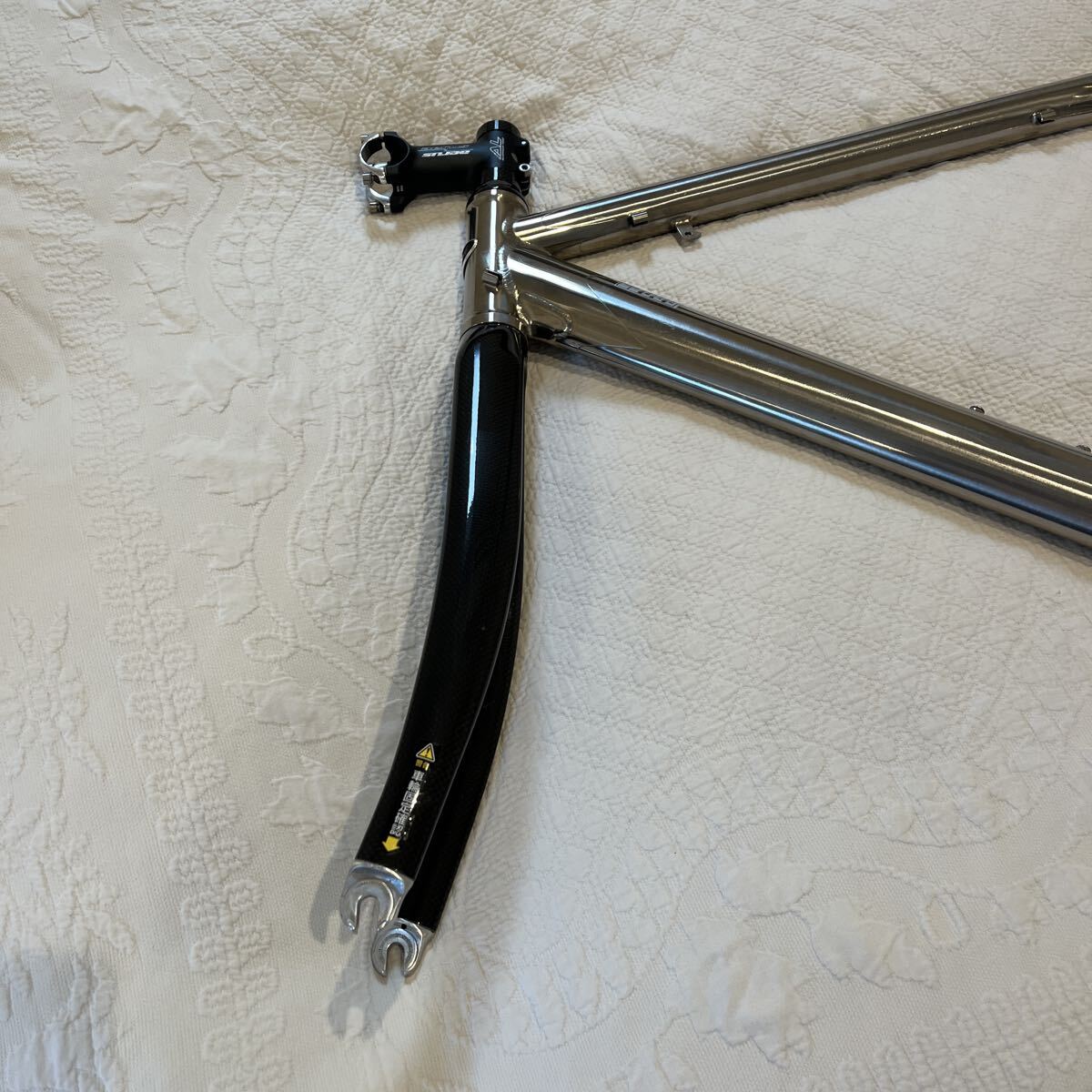 八王子シマザキにて、体格計測し組んでもらいましたので販売証明書、保証書が付属します。カーボンフォーク(おそらくミズノ製、ヘッドはCANE CREEK)の組み合わせの軽量フレームで、立ち漕ぎではバネのように粘って加速する独特なフィーリングがあります。身長168cm、体重65kg標準体型の方に最適なフレームサイズです。