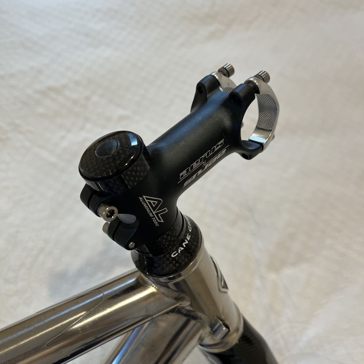 ステムはAERUSの軽量アルミステム80mm)です。転倒はありませんが、写真の通りフレーム、フォークの擦り傷、若干のひけ凹み等がございますが、ご活用いただける方の入札をお待ちしております。
