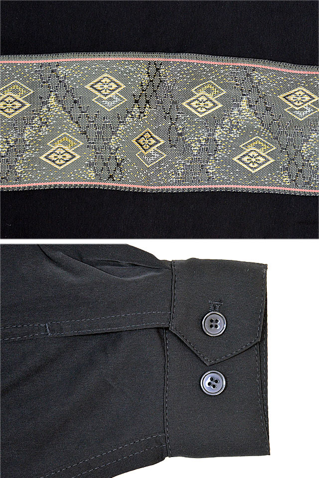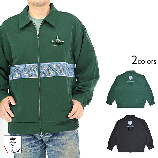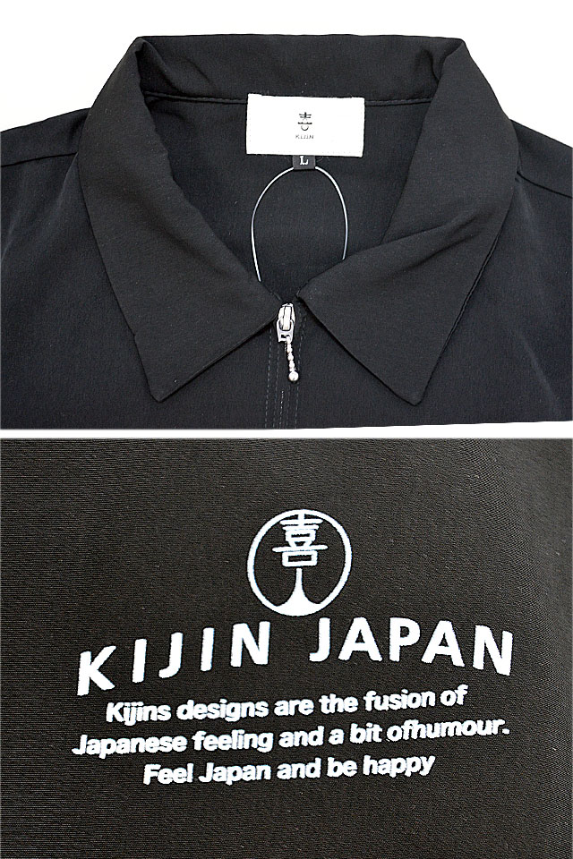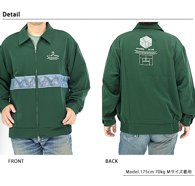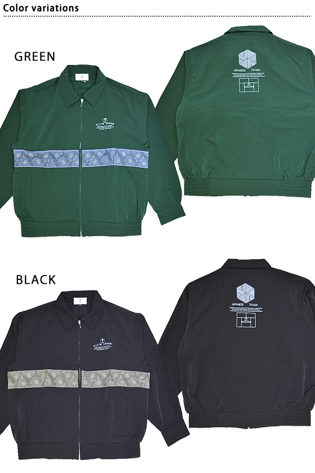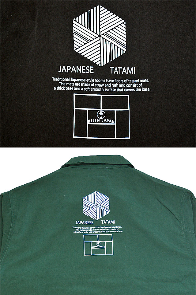 着た人、それを見た人が笑顔になれる、他にはないデザインを提供し続けている「喜人」さんから「シルケット畳ブルゾン(KJ-42801)」のご紹介です。 まるでシルクのようなしっとりとした風合いの素材に、畳のへりの生地を大胆に張り付けた一枚。 非常に柔らかい生地に対して、硬い畳のへりとの組み合わせも面白い一枚です。 背面にはい草の畳をイメージした家紋、そして日本人にとても馴染みのある「六畳間」のデザインが。 フロントジップがダブルジップなので、通気性も抜群です。 ちょっと夜が肌寒くなるこの季節に一枚持っておくと便利なジャケットです。 | |||||||||||||||