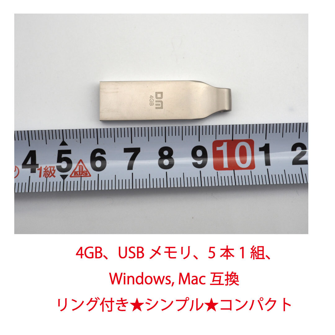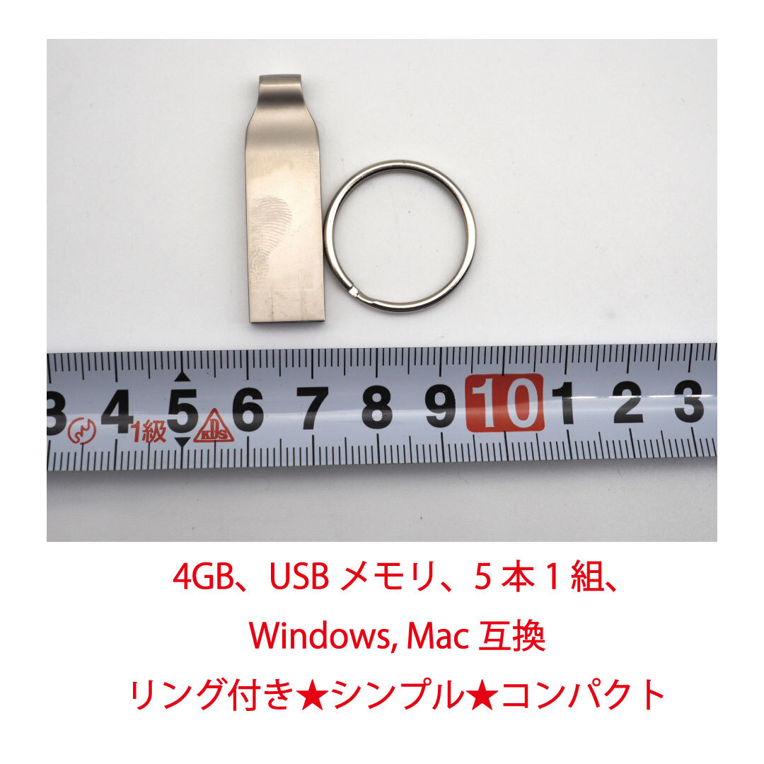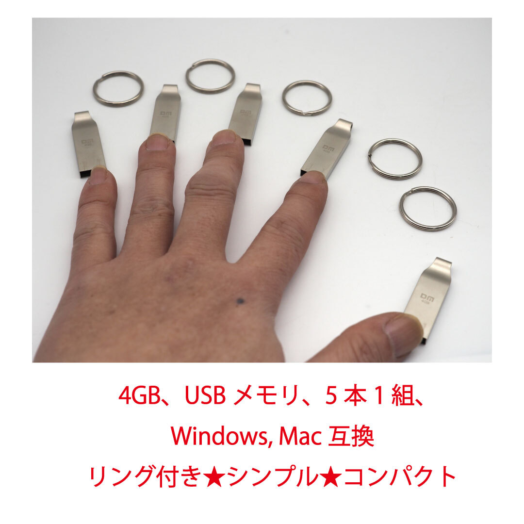 シンプルでコンパクトなUSBメモリ4GBの5本セットです。WindowsとMacで互換性のあるFAT32でフォーマットしています。リングは外してお送りしますが、リングを付けるとメモリが区別できて、携行性がアップします。