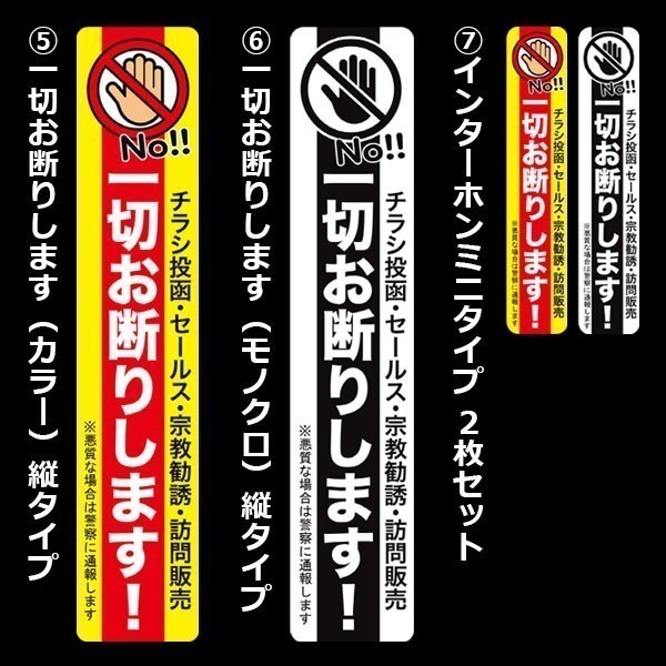 しつこい迷惑で悪質な訪問者に一切お断りステッカー! セールスマン、防犯対策、訪問販売、宗教勧誘、新聞勧誘、NHKに効果てきめん! ポストやインターフォン、玄関ドア付近にご利用ください。 ◎この商品は文字変更・サイズ変更ができません◎ 落札価格は1枚の価格です。 ●サイズ:縦150mm×横30mm ●耐候年数:3~5年 ●UV加工、防水加工 |