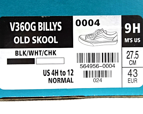 US 9H (27.5cm)【VANS V36OG BILLYS OLD SKOOL BLK/WHT/CHK 564956-0004 ヴァンズ バンズ V36OG ビリーズ オールドスクール スニーカー】