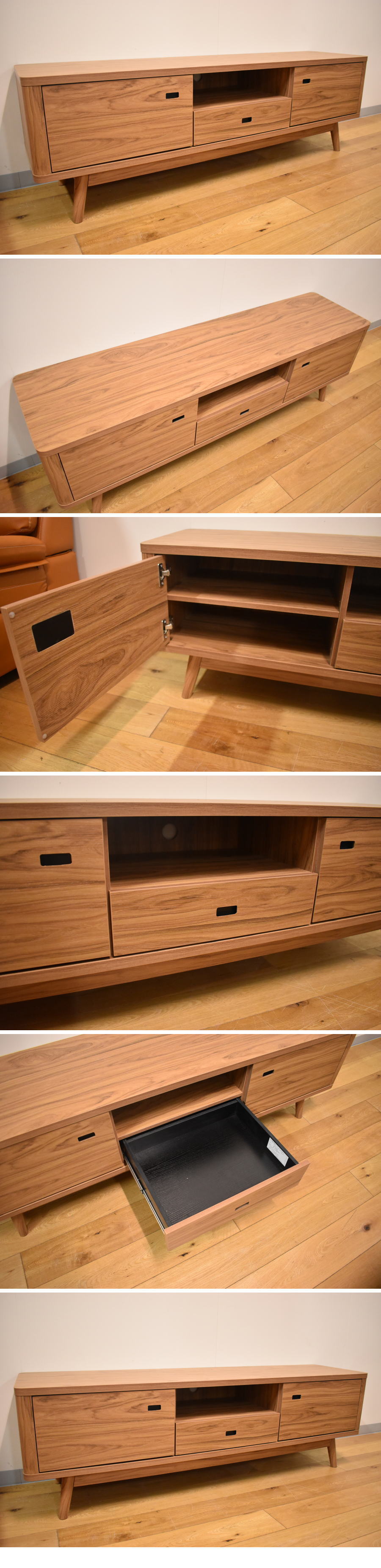 北欧スタイル ウォールナット柄159cm幅テレビ台ローボードです。 左右扉内収納は可動棚で高さ調整できます。 中央のオープンスペースはコード穴付きで、 引き出しはフルオープンスライドレール式で奥の収納物も取り出しやすいです。 シンプルでお洒落なローボードテレビ台です。 |