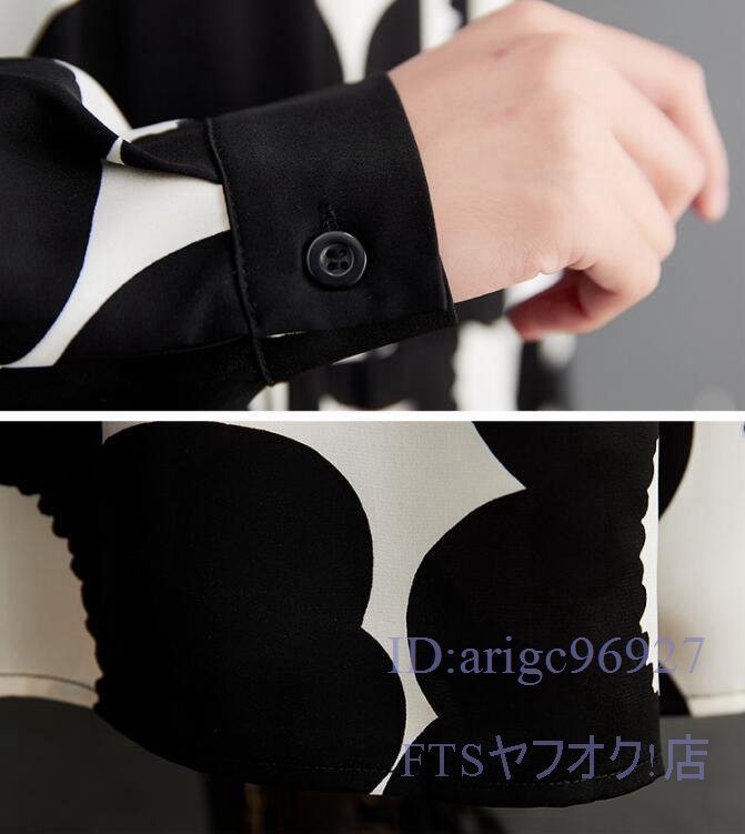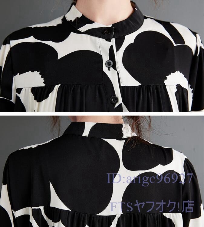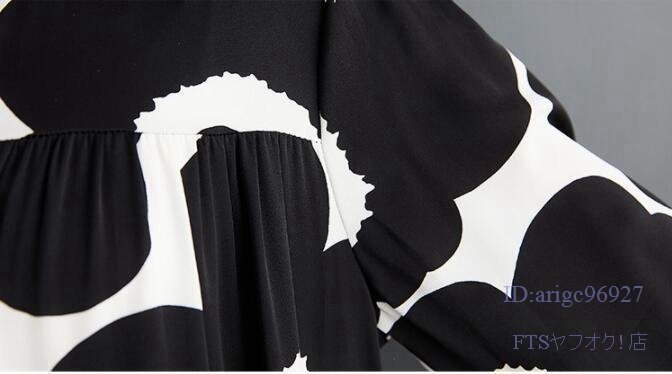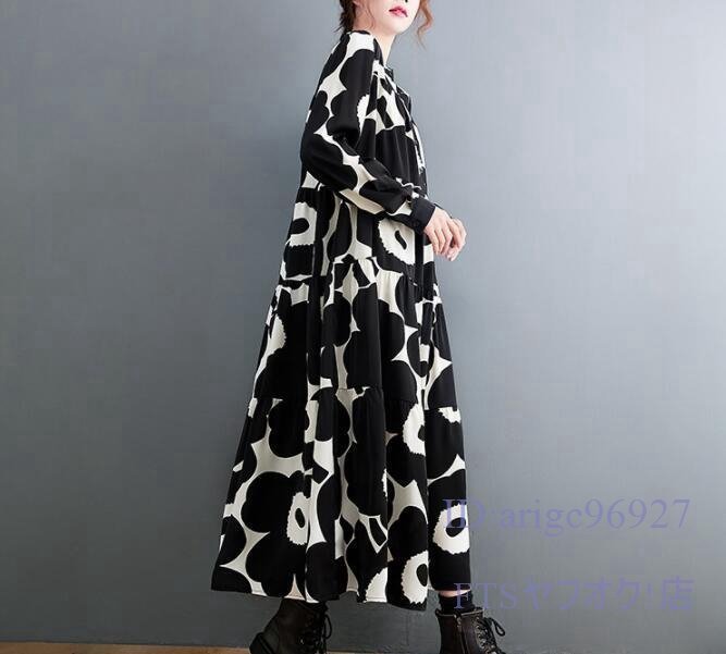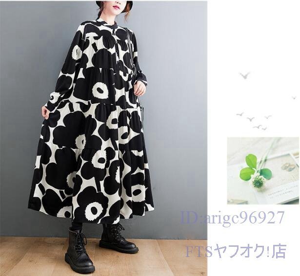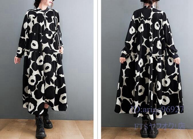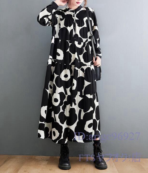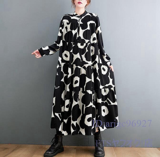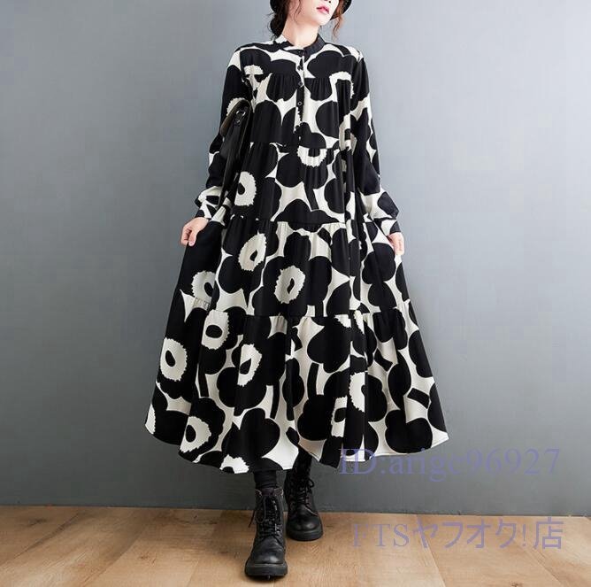 V406☆新品春うに柄スタンドカラーロングワンピース*黒白