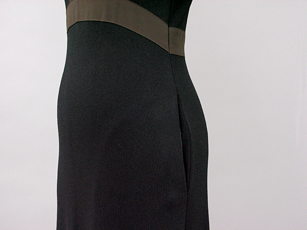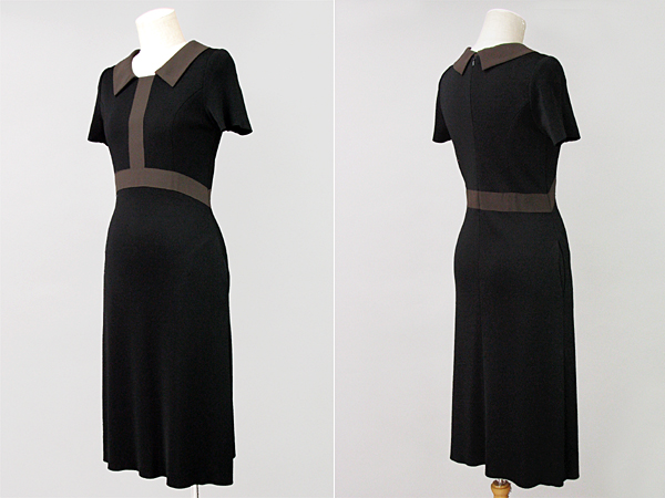 | 特徴 | こげ茶の大きな襟と、胸からウエストにかけてのラインが特徴的なワンピースです。背中ファスナー付。'03年製。ウエストのラインが、スタイルを美しく見せます。 | ||