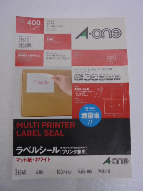 【KCM】app-6★ワケあり★A-one/エーワン ラベルシール プリンタ兼用 A4 白 4面 148.5×105mm 60枚 31545