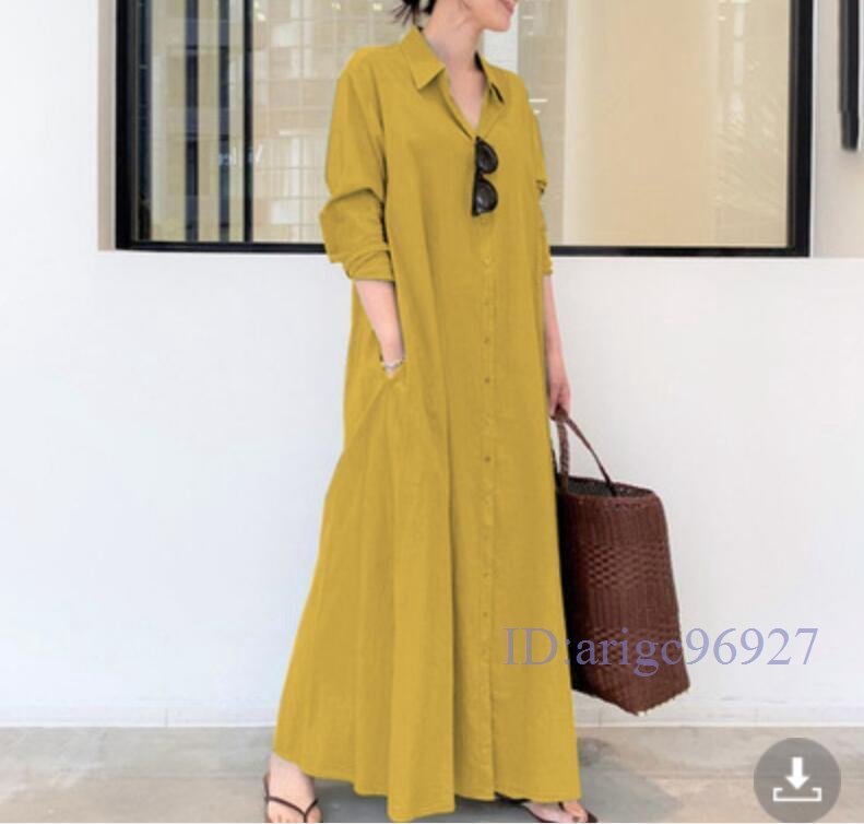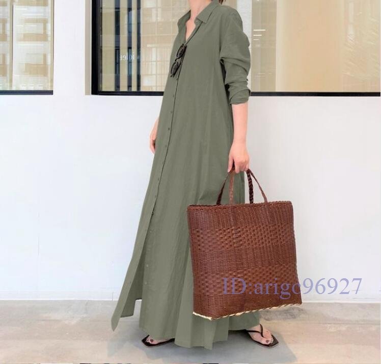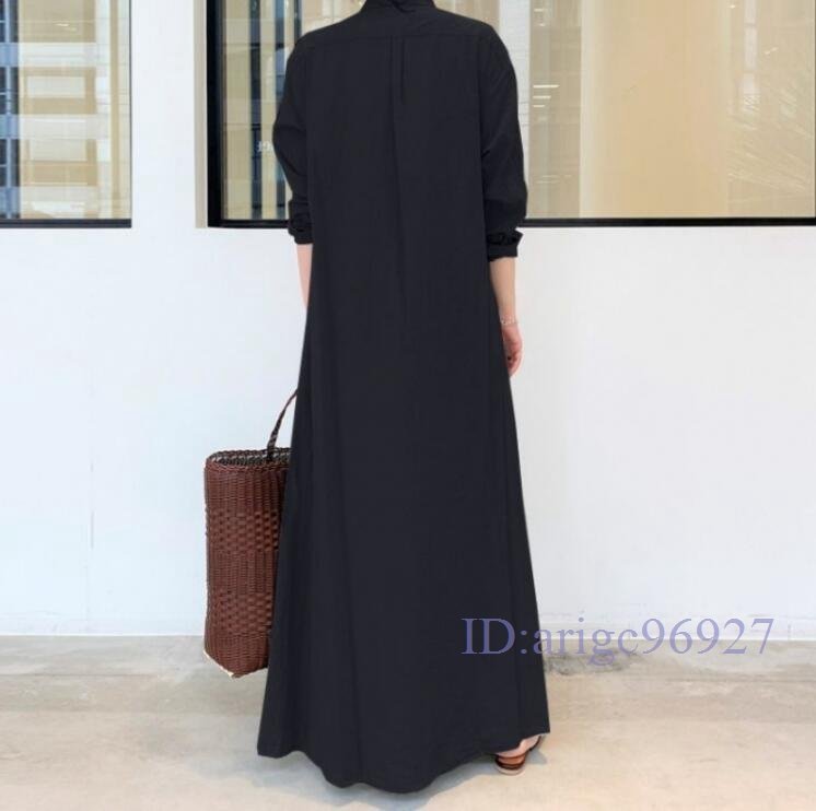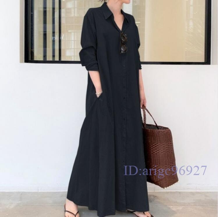 Q600☆新品春 無地 カジュアル ゆったり大きいサイズ 長袖 マキシロングシャツワンピース 黒