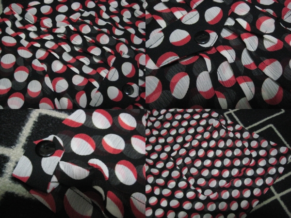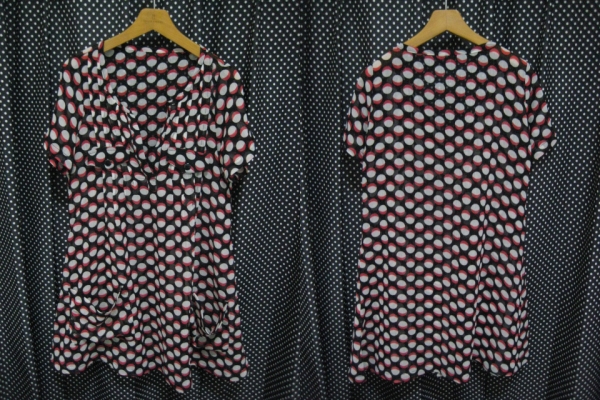 | 【ブランド名】 ティテオブルー 【表記サイズ】 なし(F)※カテゴリはMで出品しています。 【実寸】 着丈74cm(身丈77cm)、身幅(脇下)40cm 裾幅73cm、肩幅31.5cm、袖丈(肩から)18cm(脇から)6cm ※素人採寸ですので多少の誤差はご容赦下さい。 【色】 ブラック (ドット:赤白) 【素材】 ポリエステル100% 【ポイント】 胸元はVになっていて、肩から胸にかけてギャザーになっています。 フロントに大きめポケット、両胸のポケットはフェイクです。 裏地はありません。 【状態】 ほとんど着ていませんので状態いいです。 | |||