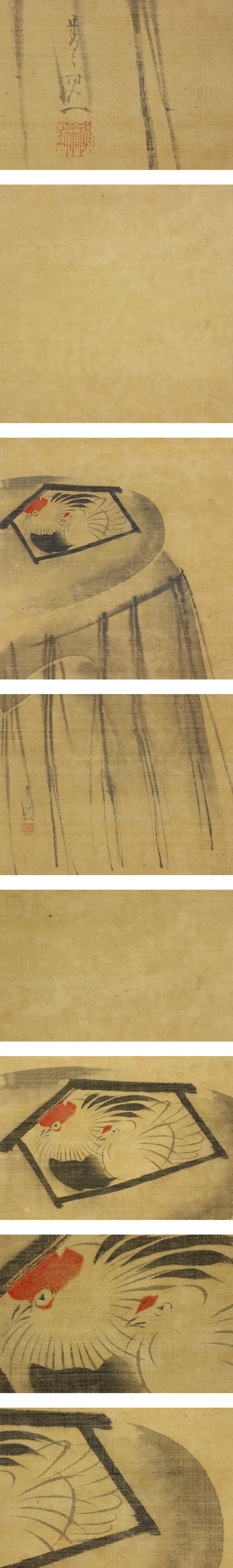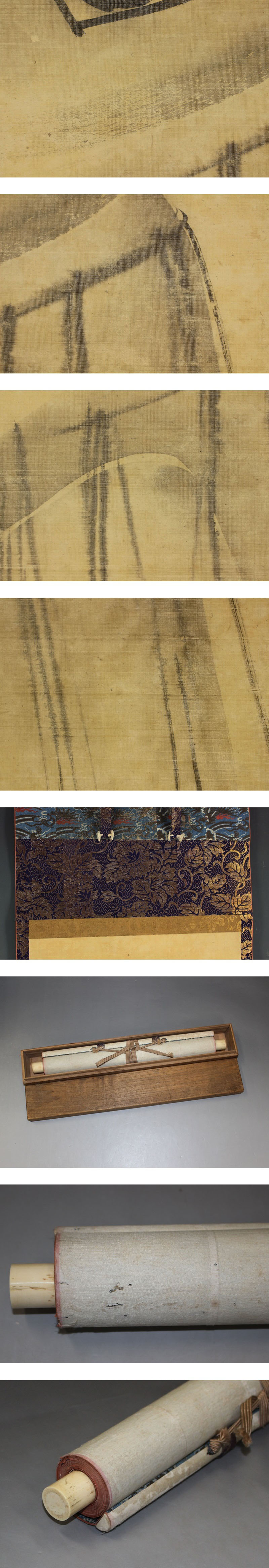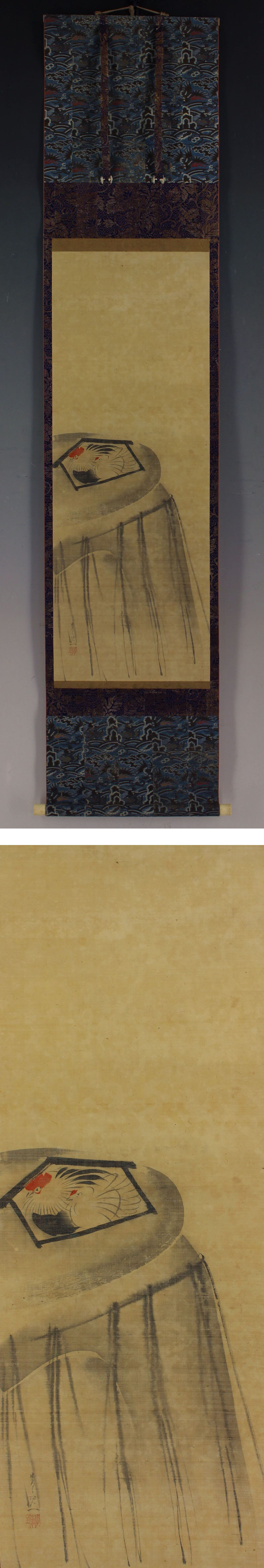 鈴木其一 すずき-きいつ(1796-1858) 江戸時代後期の画家。 寛政8年4月生まれ。琳(りん)派の酒井抱一(ほういつ)の内弟子となり,同門の鈴木蠣潭(れいたん)没後,鈴木家をつぐ。大胆な装飾的画風が特色。安政5年9月10日死去。63歳。江戸出身。名は元長。字(あざな)は子淵。通称は為三郎。別号に噲々,菁々,祝琳斎。作品に「夏秋渓流図屏風」「薄(すすき)椿(つばき)図屏風」。 本紙は、染み、汚れ、軽い皺、ヤケがあります。 表装は、染み、軽い汚れ、ほつれ、皺、虫食、破れ、軸先に汚れとヒビがあります。 【サイズ】 作品 横約33cm×縦約90cm 表装 横約36.5cm×縦約169cm |