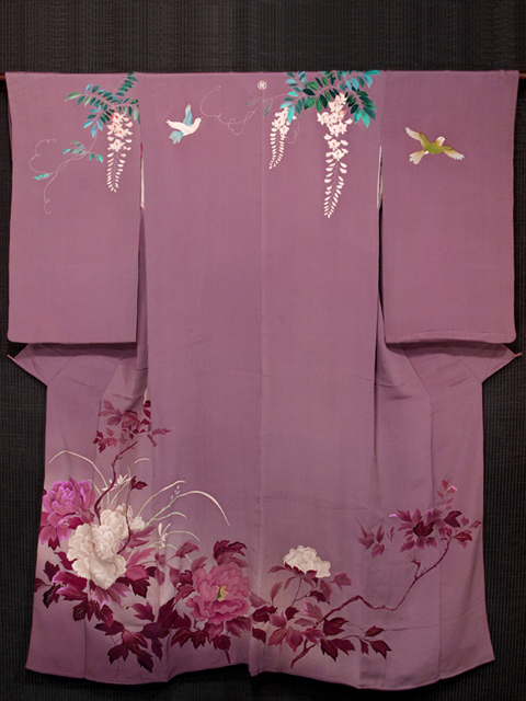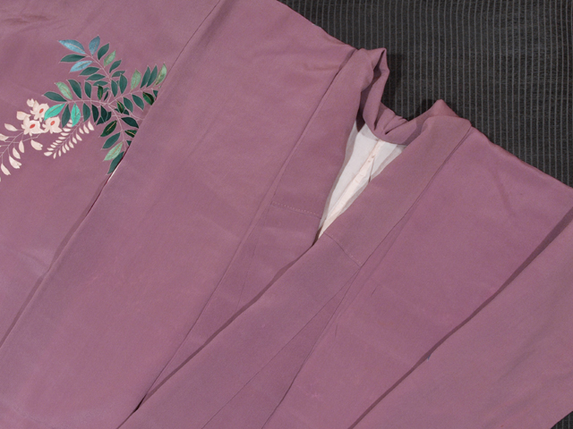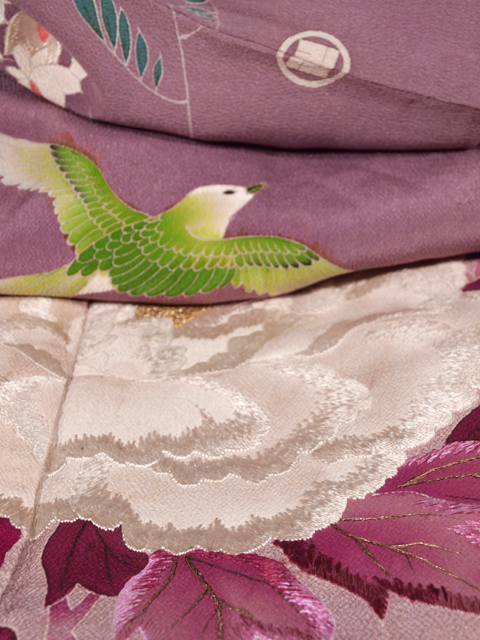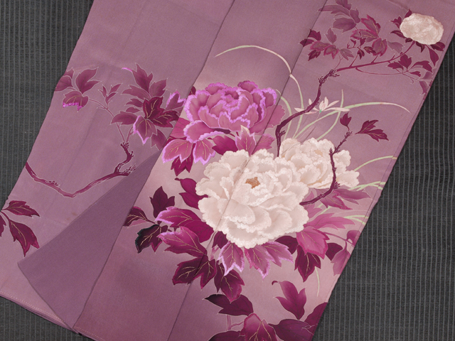 | 詳細 | 京紫色の地に牡丹と藤、鳥の文様が染められ、文様の多くに刺繍が施されている縮緬の訪問着です。袷仕立てです。 大正~昭和初期ごろにつくられたと思われるアンティークのお品です。品よく艶やかなお色目、ろまんが香る大ぶりの花々、そして優雅に舞飛ぶかわいらしい鳥など、見飽きない完成度の高い意匠です。ややシボの大きなやわらかな手ざわりの縮緬地です。袖裏の八掛には紅絹が用いられています。BR> 上前身ごろの胸付近に直径約 1cm のごくうっすらとした黄変が 2~3 か所、右前袖たもと角丸に直径約 1cm のごくうっすらとしたうすよごれが 2~3 か所、下前身ごろの裾上付近に直径約 1cm のごくうっすらとしたうすよごれが 2 か所あるほか、全体のところどころに直径約 2~5mm のごくうっすらとした黄変やうすよごれ、変色がちらほらとありますが、いずれもあまり判別はつかず、気にはなりません。そのほかに目につく大きなしみやよごれ、褪色などのダメージはなく、この時代のものとしては全体的にきれいな状態なので、アンティークにご理解のある方であれば、ご着用は可能です。 |