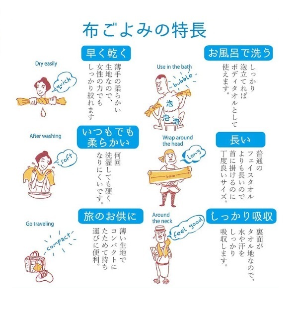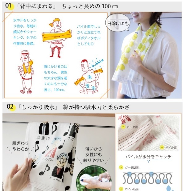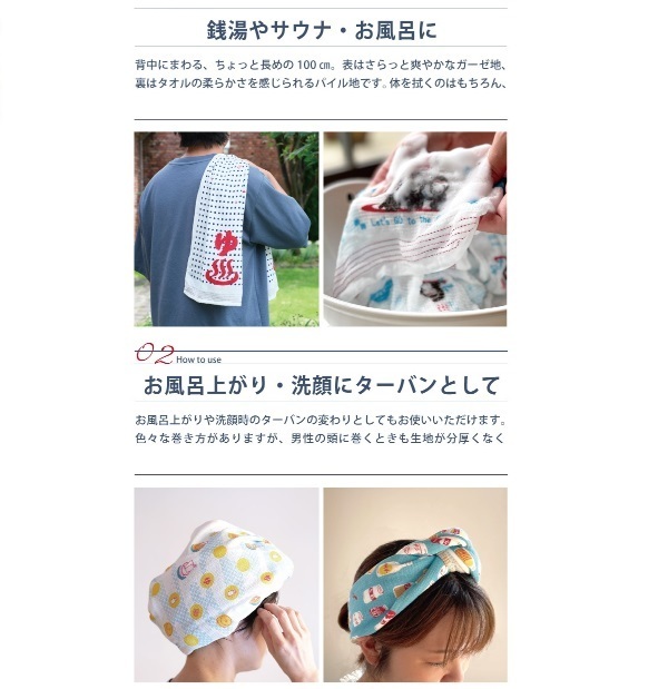 日本の風土が生んだ和てぬぐいの使い勝手の良さと、タオルが持つ吸水性と柔らかさを併せ持った万能タオルです。