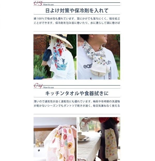 一般的なフェイスタオルよりも長く100㎝あるので、 首にかけても落ちにくく、端を結ぶことが出来ます。