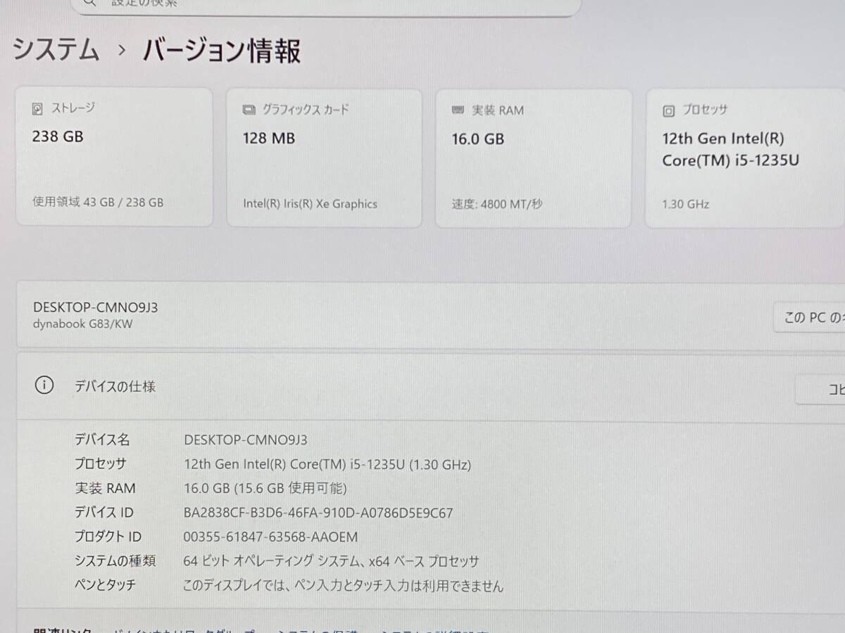 (訳あり)東芝 dynabook G83/KW A6GNKWLCD6DA/ Core i5-1235U 1.3GHz/ 16GB / 256GB / windows 11Pro