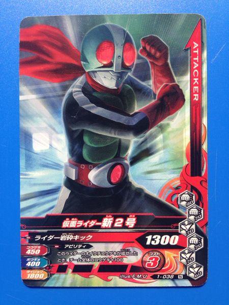 仮面ライダー、ガンバライジングの第1弾から、No.038《仮面ライダー新2号》の登場です。発送は、普通郵便を利用します。(特にご希望のない場合)おとりまとめも可能ですが、送料に変動する場合がございます。また、送料のご請求は、自宅での計量を基準にご請求させていただいておりますので、実際の金額と差異が出る場合もございます。予めご了承ください。他にも多数出品中です。まとめてこの機会にいかがでしょうか?ご質問お待ちしております。