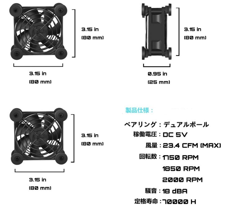 サイズ:80×80×25mm。このUSB冷却ファンは耐用性よくて