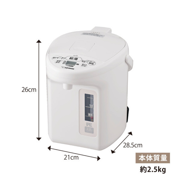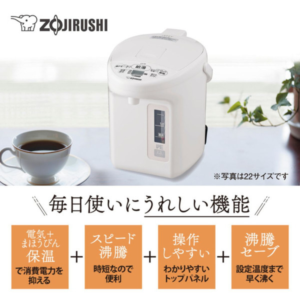 象印のVE電気まほうびんは、電気とまほうびん構造を組み合わせてかしこく保温し、消費電力を抑えます。