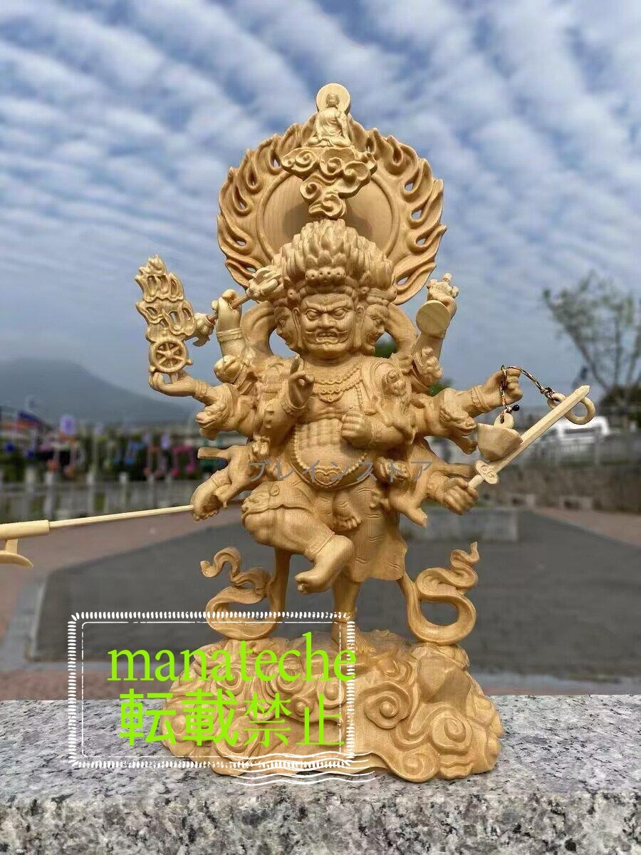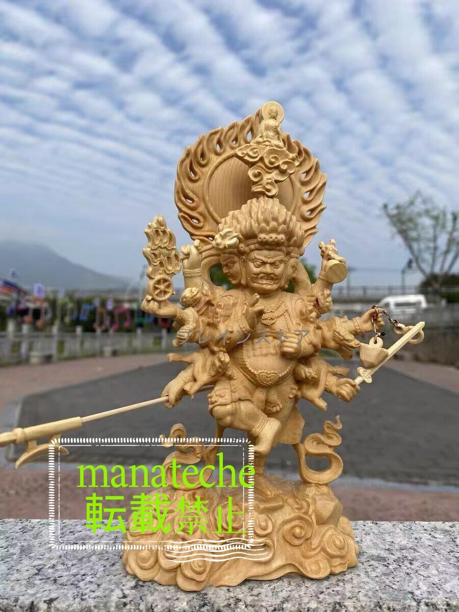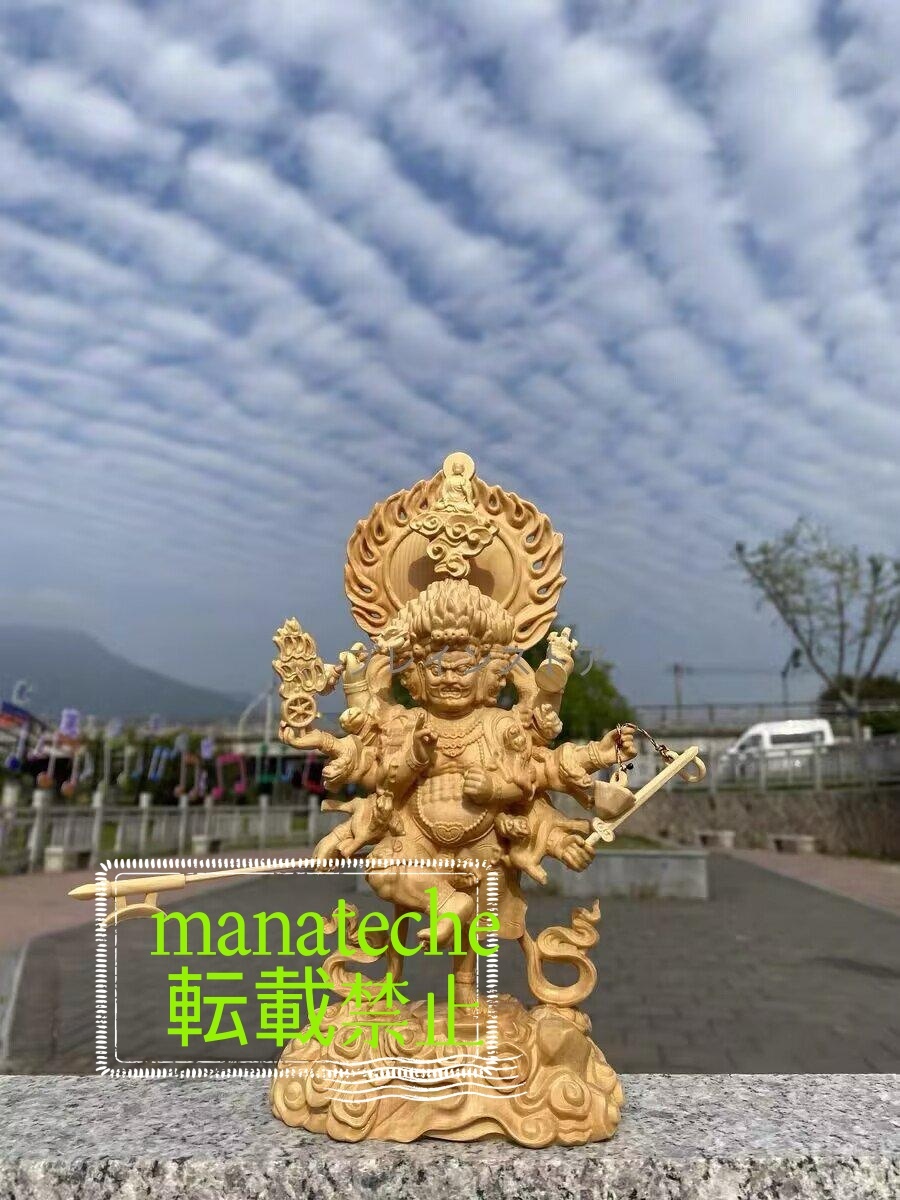 ●状態 :新品 ●【カラー】画像参照 密教における明王の一尊です。「烏枢瑟摩」「烏芻沙摩」「烏瑟娑摩」「烏枢沙摩」とも表記されます。真言宗・天台宗・禅宗・日蓮宗などの諸宗派で信仰されます。 烏枢沙摩明王は一面六臂であったり三面八臂であるなど、他の明王に比べて表現にばらつきがあるが、主に右足を大きく上げて片足で立った姿であることが多い(または蓮華の台に半跏趺坐で座る姿も有名)。髪は火炎の勢いによって大きく逆立ち、憤怒相で全ての不浄を焼き尽くす功徳を表している。また複数ある手には輪宝や弓矢などをそれぞれ把持した姿で表現されることが多い。 特に有名な功徳としては火神・厠の神・トイレの神様・清めの神様、子宝の神様、お金の神様として信仰されることが多いです。 材質:木。 サイズ:23CM ■海外輸入商品