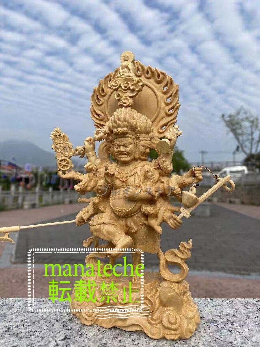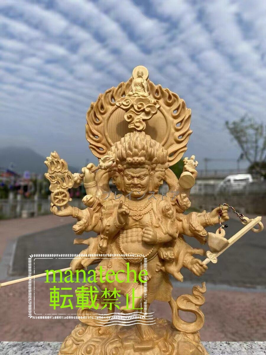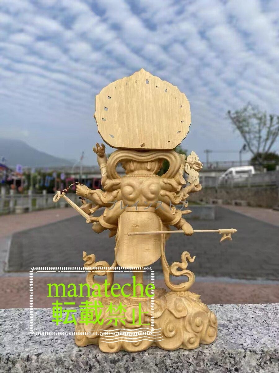 ●状態 :新品 ●【カラー】画像参照 密教における明王の一尊です。「烏枢瑟摩」「烏芻沙摩」「烏瑟娑摩」「烏枢沙摩」とも表記されます。真言宗・天台宗・禅宗・日蓮宗などの諸宗派で信仰されます。 烏枢沙摩明王は一面六臂であったり三面八臂であるなど、他の明王に比べて表現にばらつきがあるが、主に右足を大きく上げて片足で立った姿であることが多い(または蓮華の台に半跏趺坐で座る姿も有名)。髪は火炎の勢いによって大きく逆立ち、憤怒相で全ての不浄を焼き尽くす功徳を表している。また複数ある手には輪宝や弓矢などをそれぞれ把持した姿で表現されることが多い。 特に有名な功徳としては火神・厠の神・トイレの神様・清めの神様、子宝の神様、お金の神様として信仰されることが多いです。 材質:木。 サイズ:23CM ■海外輸入商品