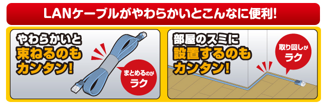 ■ケーブルがやわらかく、取り回しがしやすいのでスッキリと配線できる”やわらかLANケーブル”です。