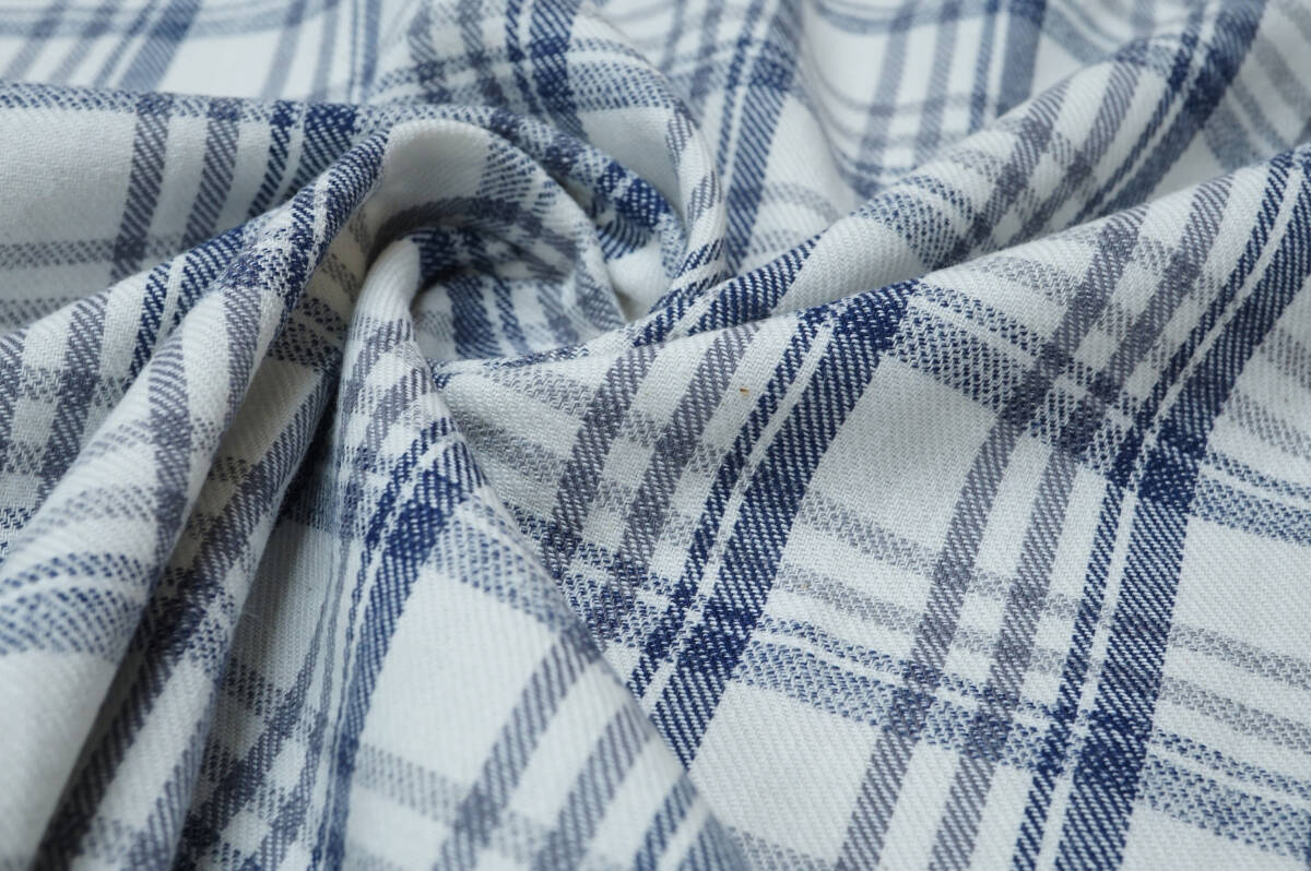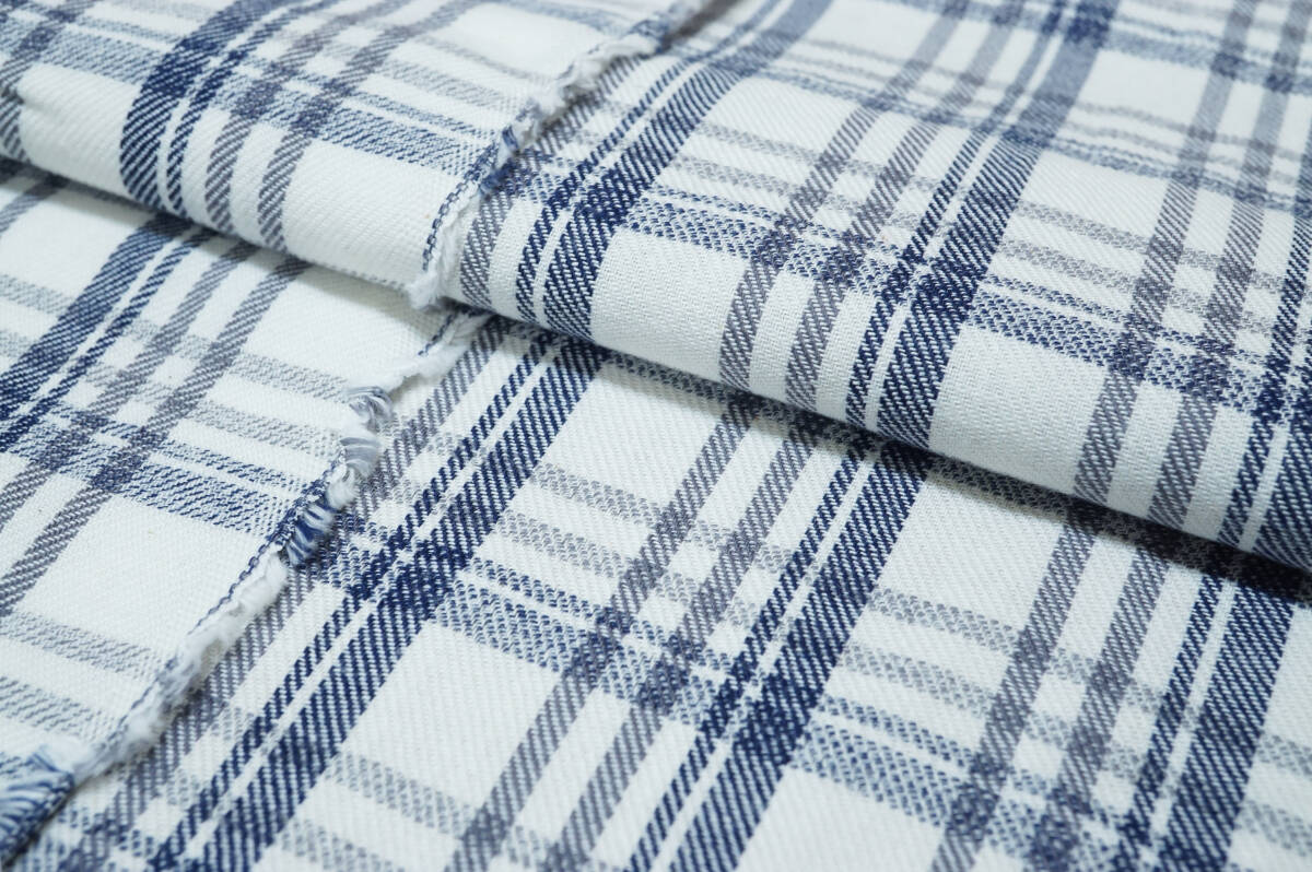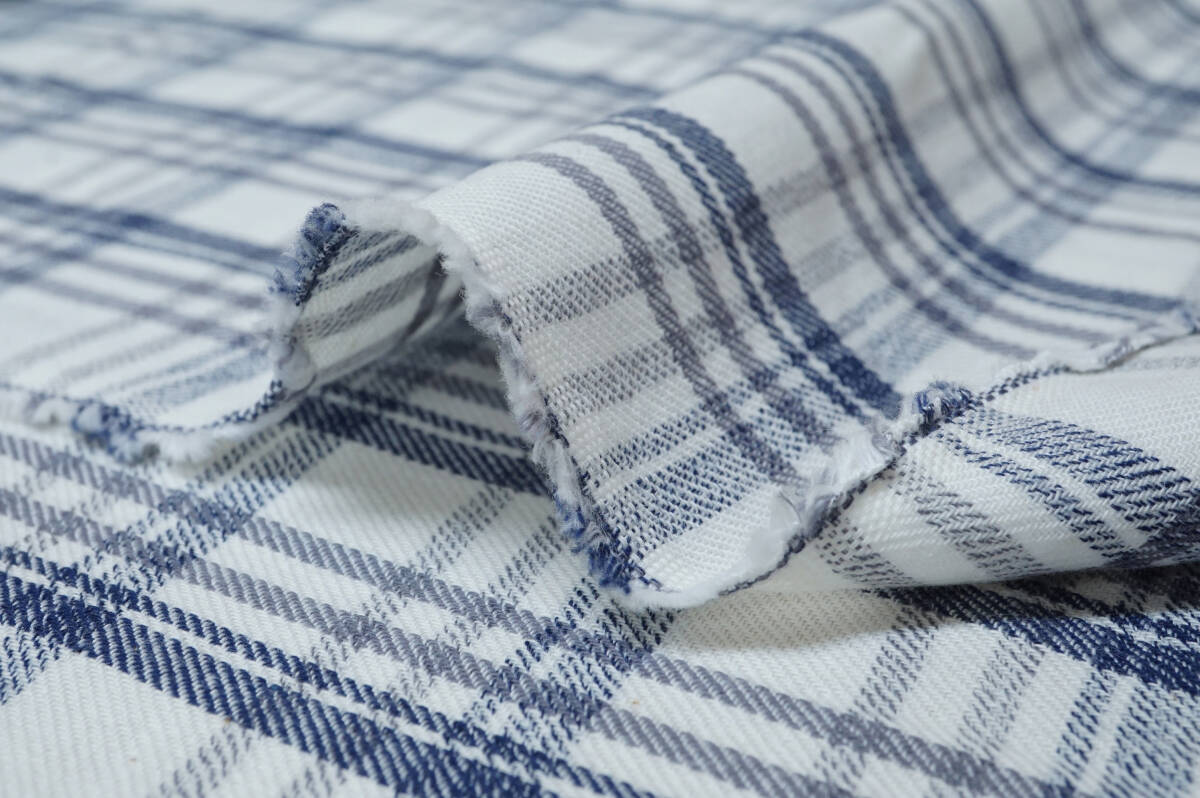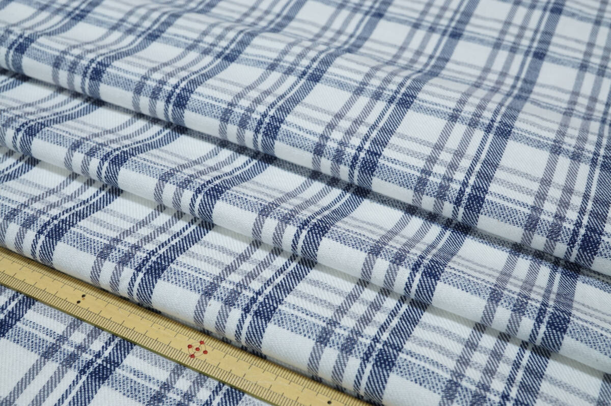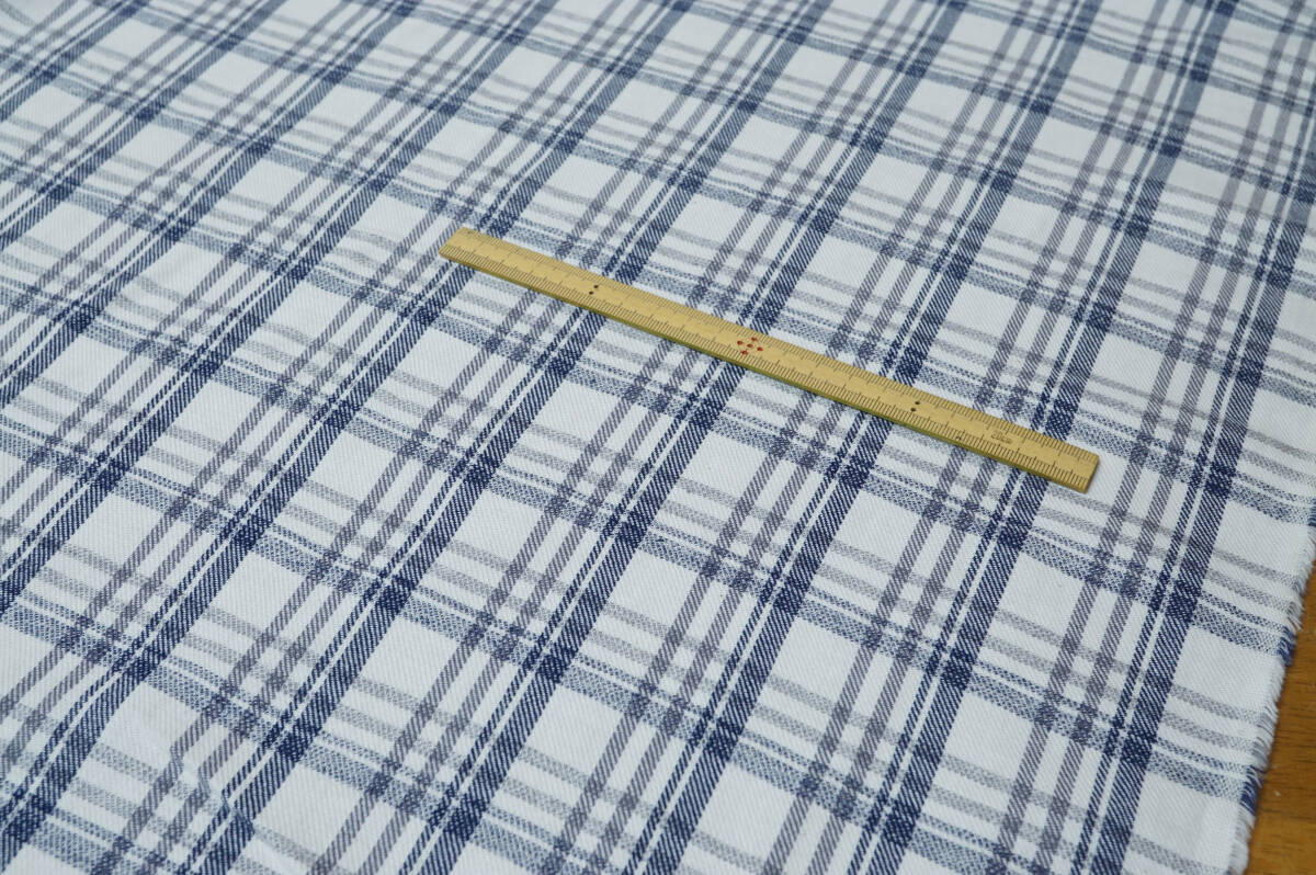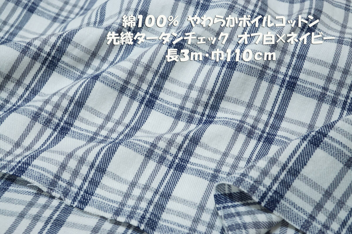 綿100%、微薄(シーチング程度)、スルスルやさらさらという質感ではなく、ボイルのしっとりソフトな手触りで、色調:オフ白×ネイビー・グレー系の先織タータンチェック柄でございます。