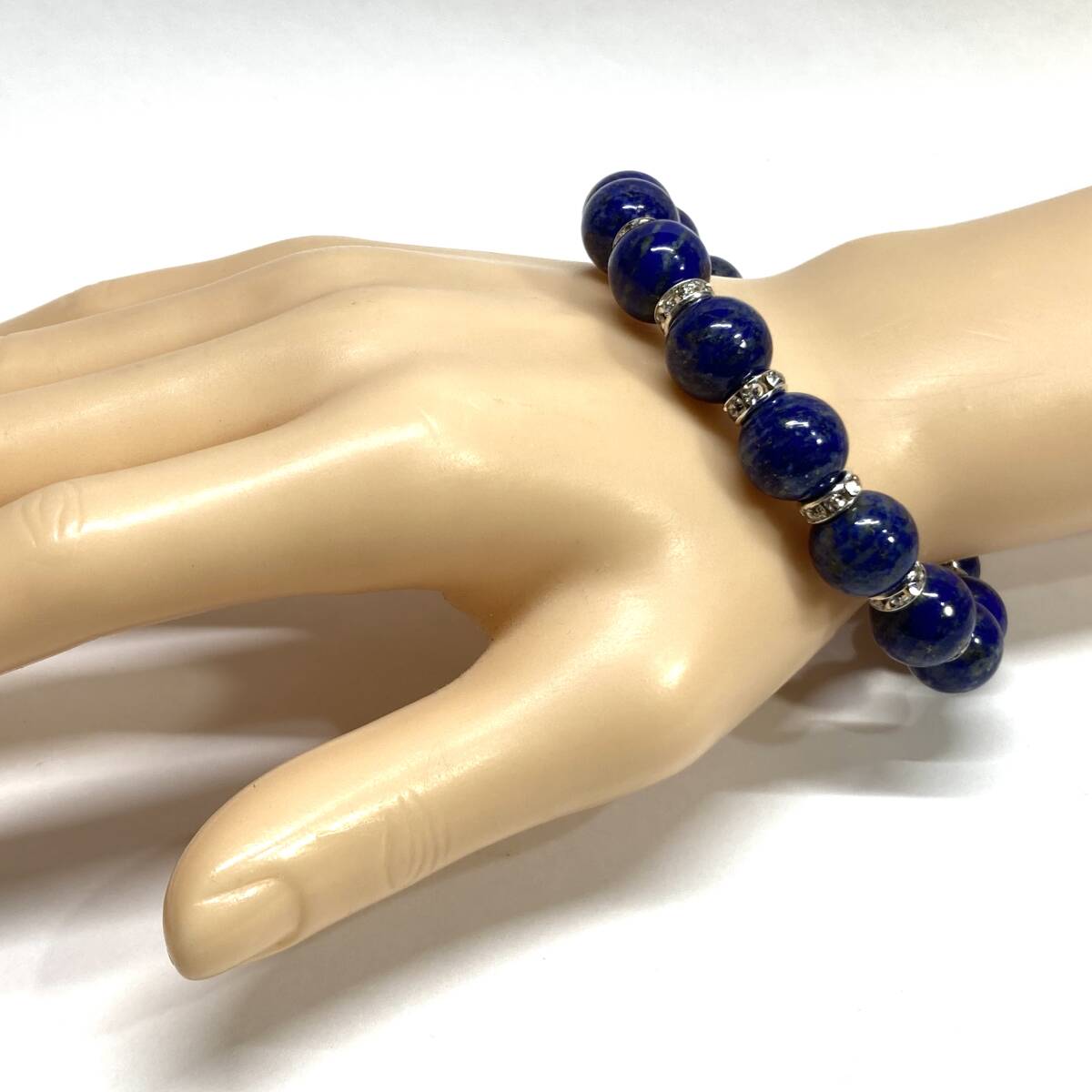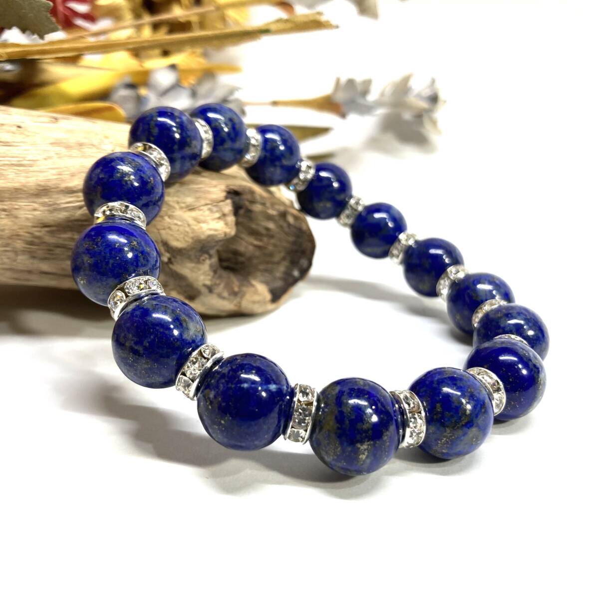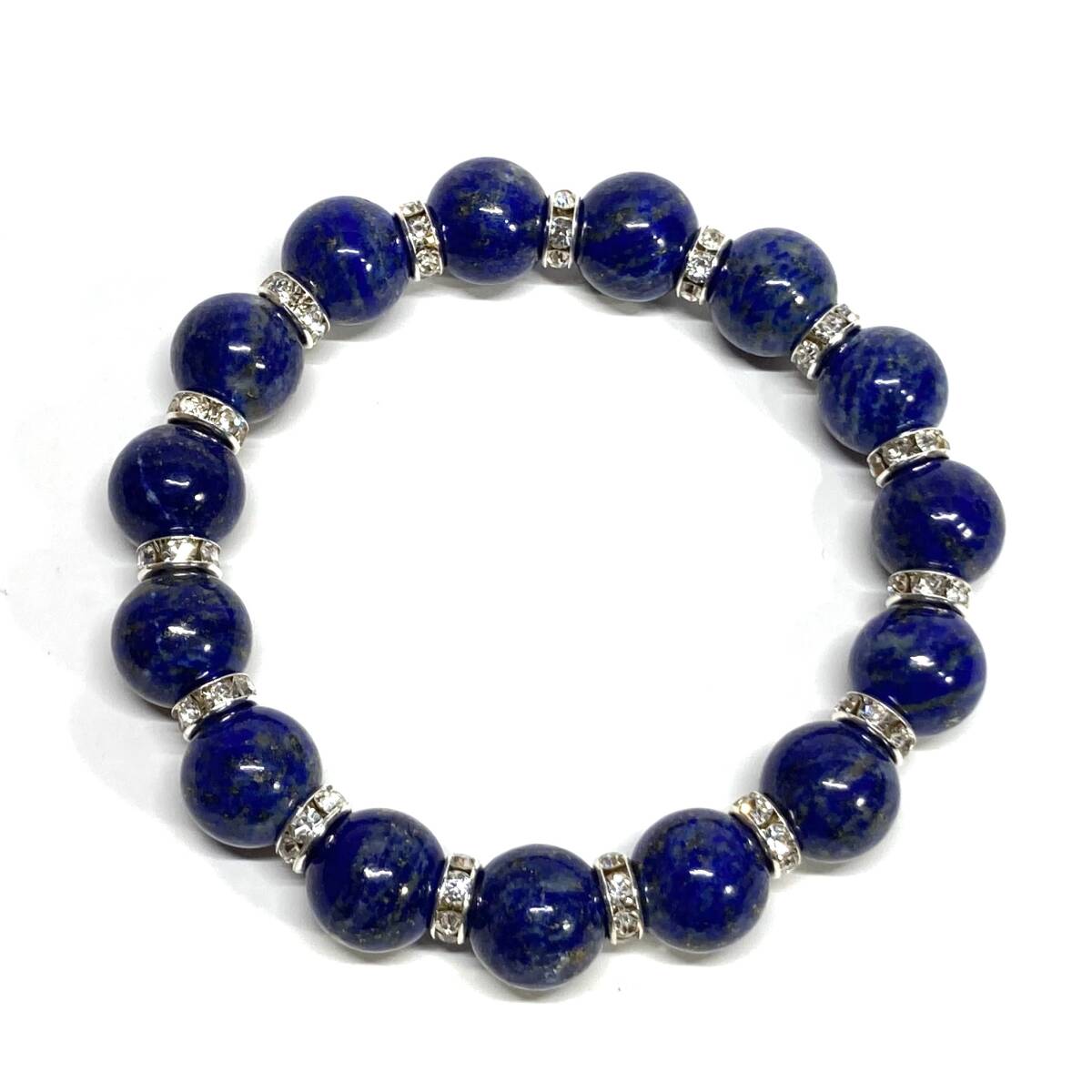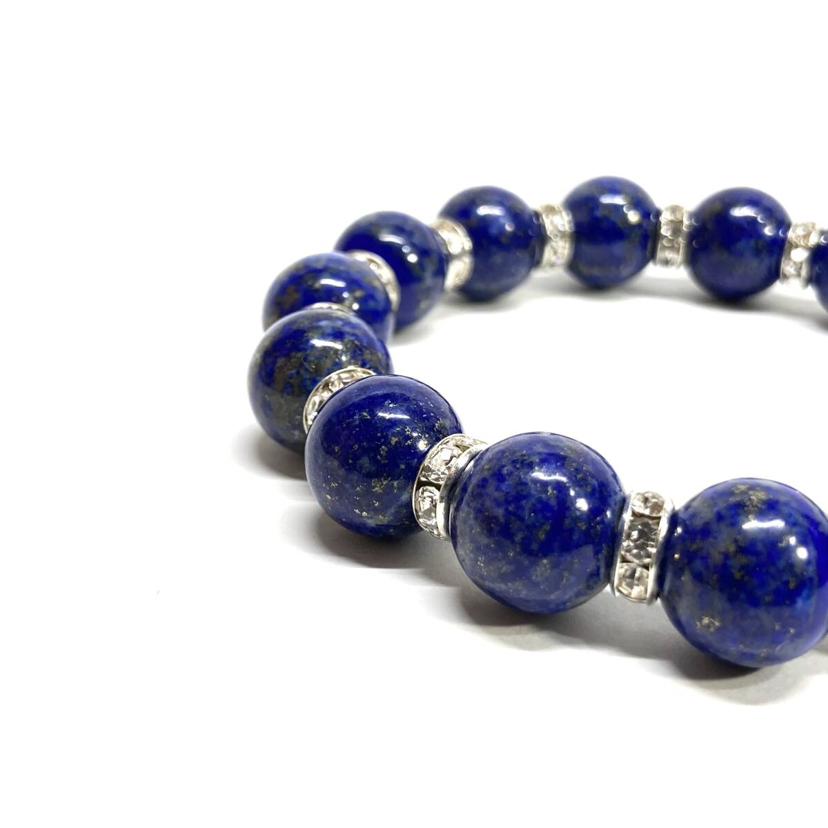 こちらは、12mm玉のラピスラズリを使用したブレスレットです。石との間にはロンデルを挟み高級感を演出しています。シンプルなデザインですのでどんなコーディネートとも合わせ易いブレスレットです。石大きさは12mm玉です。内周約18cmです。(サイズ変更の場合は取引ナビにてご連絡をお願いします。) 数に限りがございますので気になる方はお早めにどうぞ。
