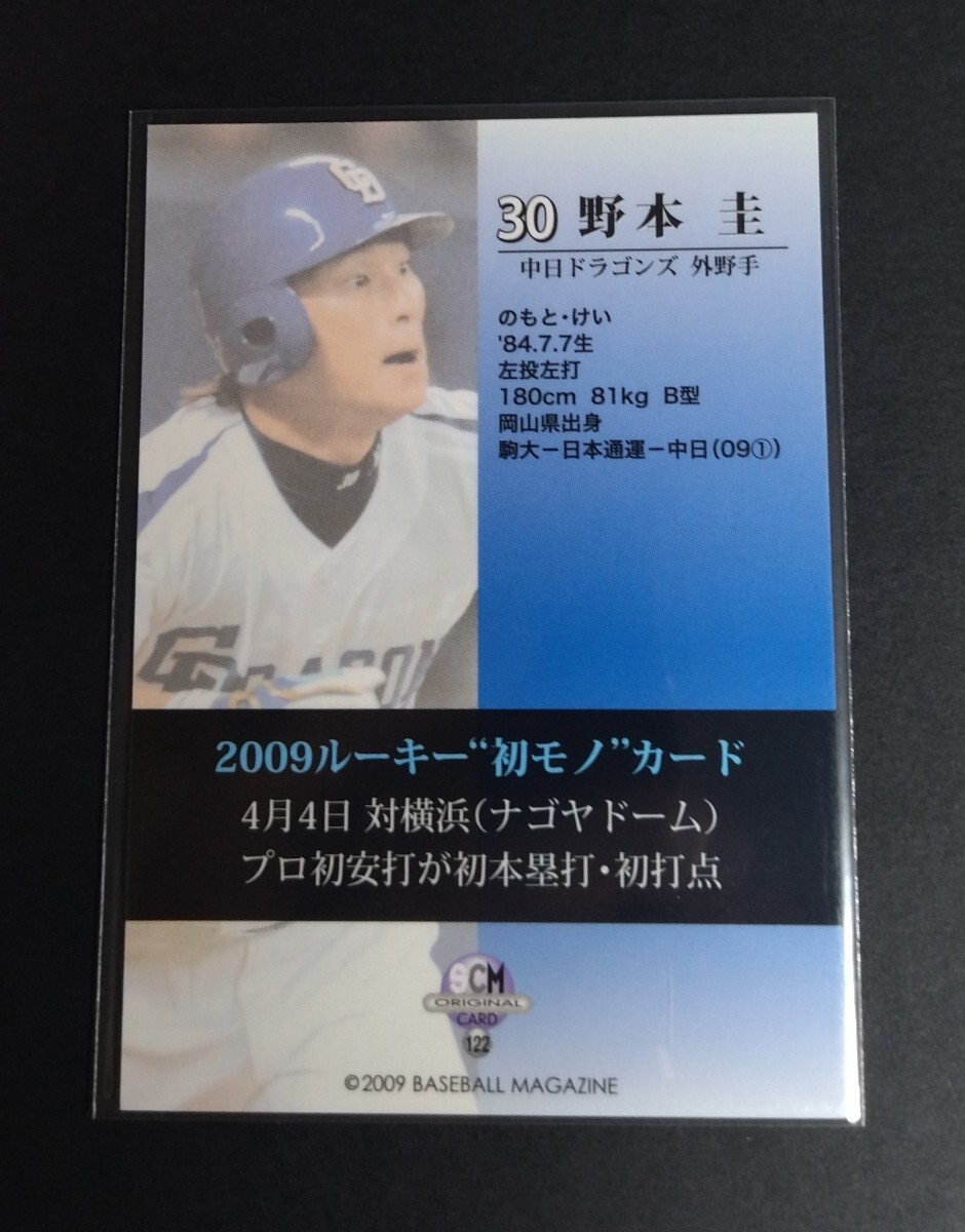 2009年BBM 野本圭(中日)ルーキー初モノカード。SCMオリジナル。No,122。※付録カード特有の初期線跡あり(画像3、4)