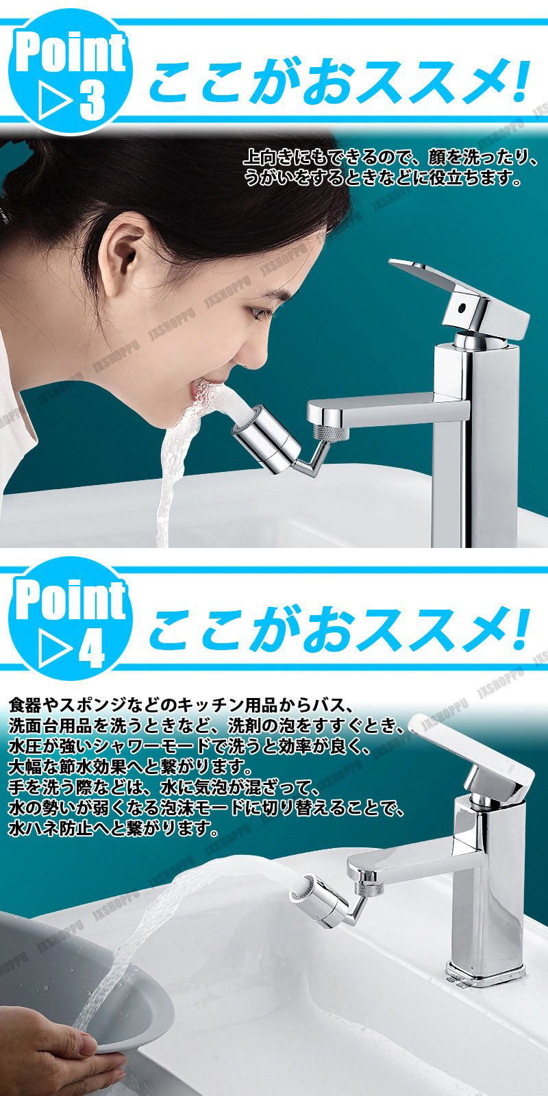 上向きにもできるので、顔を洗ったり、うがいをするときなどに役立ちます。