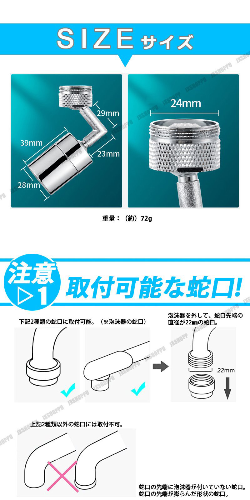 ネジ部の直径が22mmかつ外ネジ式の水栓のみ対応いたします。