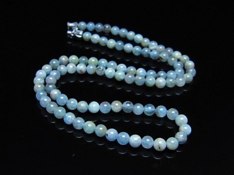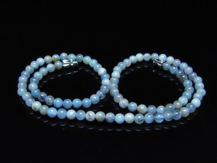 | ■商品名: アクアマリンネックレス ■商品ID: T556-3641 ■商品重量:約 12.2g ■商品サイズ:粒直径約:5mm 【アクアマリン(藍玉)】 3月の誕生石として知られた天然石です。 ベリル(緑柱石)の一種のためエメラルドやモルガナイト、レッドベリルなどと同じグループにあるパワーストーンで、アクアマリンはブルーベリルの別名を持ちます。 「アクアマリン」という名称の語源はラテン語で水の意味のアクアと海の意味のマリナスに由来しています。 古代ローマの漁夫たちが海難防止と豊漁のお守りにしていたことや、海の精の宝物が海底から浜辺に打ち合げられて宝石になったとされているという言い伝えがあり、アクアマリンは旅の安全のお守りとして一つは持っておきたいストーンです。 また、アクアマリンは穏やかさと包容力をもたらし、免疫力を高め体の不調を整え精神面と体調面でのサポートをしてくれるとされています。 さらには夫婦愛を高め恋人同士のすれ違いを無くすとされ、安産や子宝に恵まれる効果もあるともいわれています。 このように幸せな結婚を象徴する事から、アクアマリンは結婚や出産の贈り物におすすめです。 ⇒ アクアマリンをもっと詳しく ◆ワンポイント情報 アクアマリンの劈開は不明瞭、モース硬度は7.5~8となり十分な硬度がありますのであまり取り扱いに神経質になる必要はありませんが、石自体の内部にあるクラックやインクルージョンに力や衝撃が加わると割れてしまう可能性もある点にご注意下さい。 |