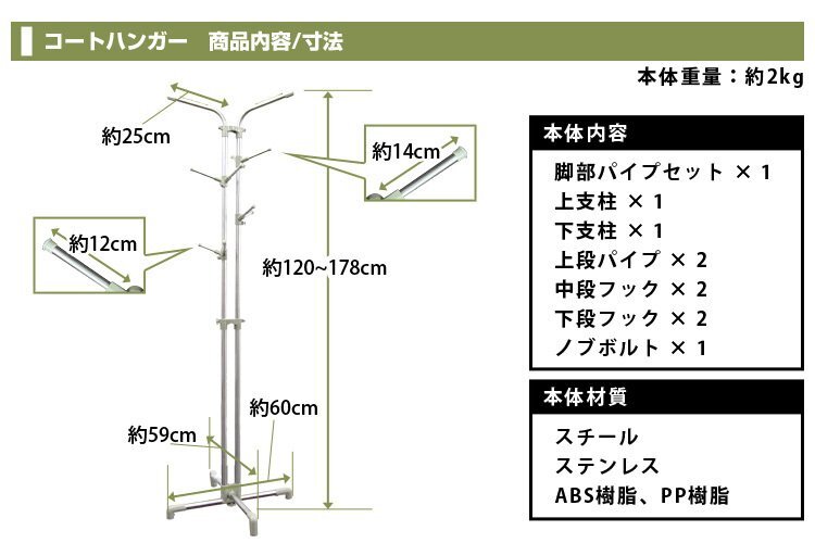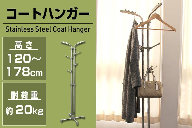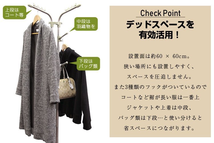 毎日使うバッグやジャケット、コート。「どうせ明日も使うから」なんてソファの上に置きっ放しになってませんか。 コートハンガーならスペースも取らず機能的に収納して頂けます!! 毎日使う物はサッと取れて、簡単に片付けられる収納がおすすめです♪ コートハンガーは10本のフックで収納力も抜群。 フックは180度動かせて設置位置も自由に変更できるのでお好みに合わせて設置できます! ついつい置きっぱなしのモノもすっきりとします。 高さは120cm~178cmまで自由に調整できます!! 【商品仕様】 サイズ(約):直径60cm×高さ120~178cm 重量(約):2kg 耐荷重(約):20kg ※全フックの合計の許容値 材質:スチール、ステンレス 他 【注意事項】 ※お客様組み立てとなります。 ※当商品設置に伴う損害(落下に起因する損害、壁の汚れ、壁の損傷等)に対する責任は負いかねます。 |
