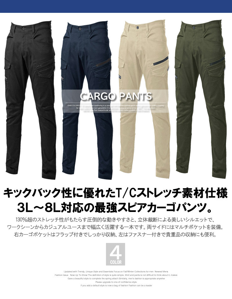 | 商品説明 | キックバック性に優れたT/Cストレッチ素材を採用した、3L~8L対応のスピアカーゴパンツが登場。 |