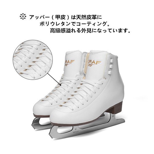 【商品特徴】[保温性]:内側には柔らかなボア素材を採用しているため、保温性が抜群です。[機能性]:◎充実の機能とデザインを両立させたフィギュアスケート靴      ◎抜群のフィット感はそのままに、足首のホールド性が格段にアップ。      ◎ハードな造りで、履き口にあしらったスポンジでソフトな足あたりを実現しました      ◎靴の中底には、強化プラスティックを使用し、激しい演技にも対応できる、[撥水加工]:アッパー(甲皮)は天然皮革で       通気性を保証できるとともに、良い防水性も備わっています。[御使用対象]:初心者-中級者向けのフィギュアスケート靴※サイズについて※普段履いているスニーカーやパンプスで一番大きいサイズをお勧めしております。大き目のサイズをご希望のお客様には、0.5cm,1cm上のサイズをご選択いただき、靴下の履き方(厚手の靴下,2枚履き)や中敷きのご利用等で調節される事をお勧めしております。※研磨について※ある程度研磨された状態でメーカーより出荷されますので、すぐに滑走が可能です。