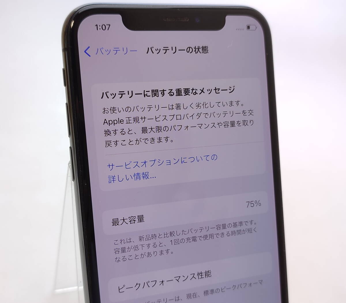 動作確認時のバッテリー性能表示75%(最大容量、著しく劣化の表示