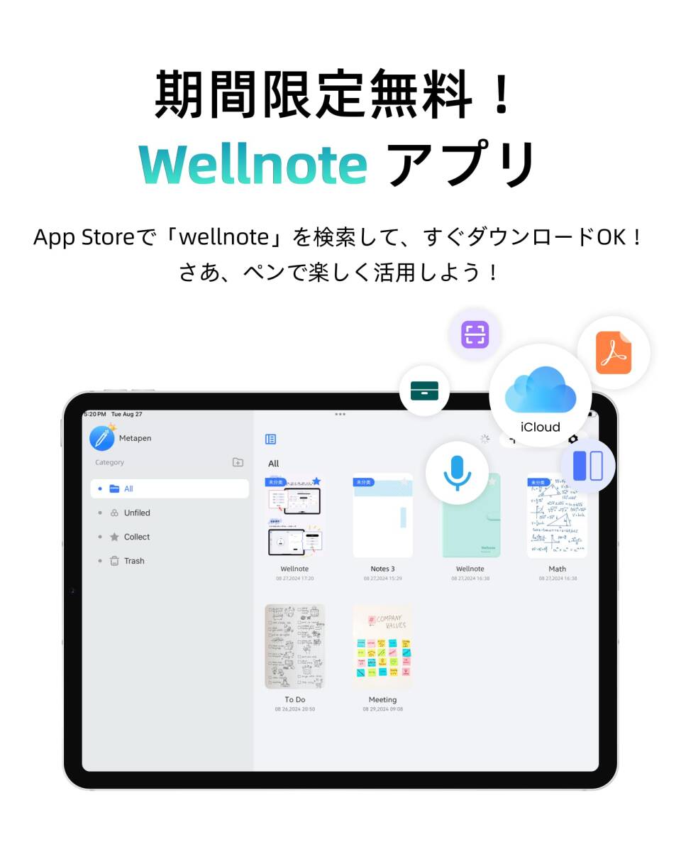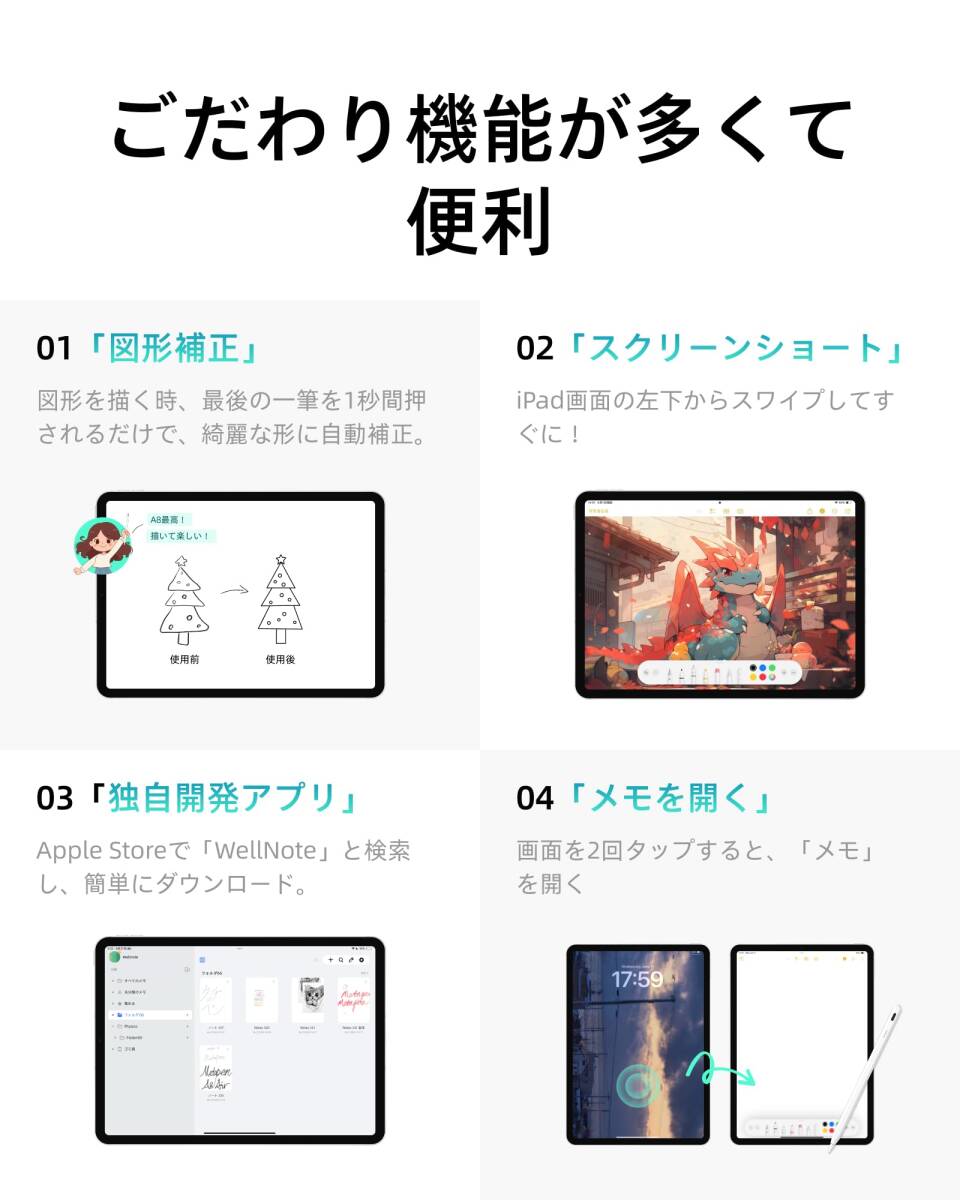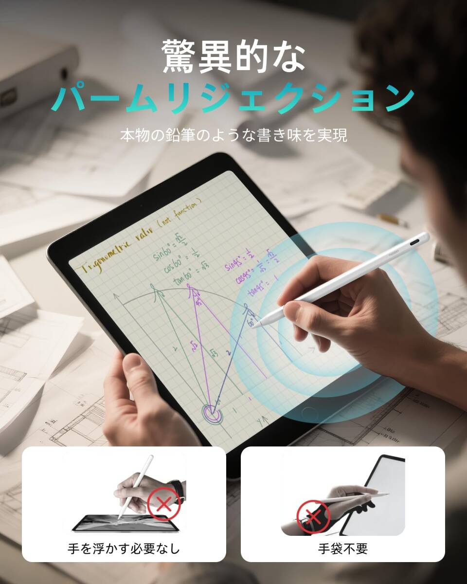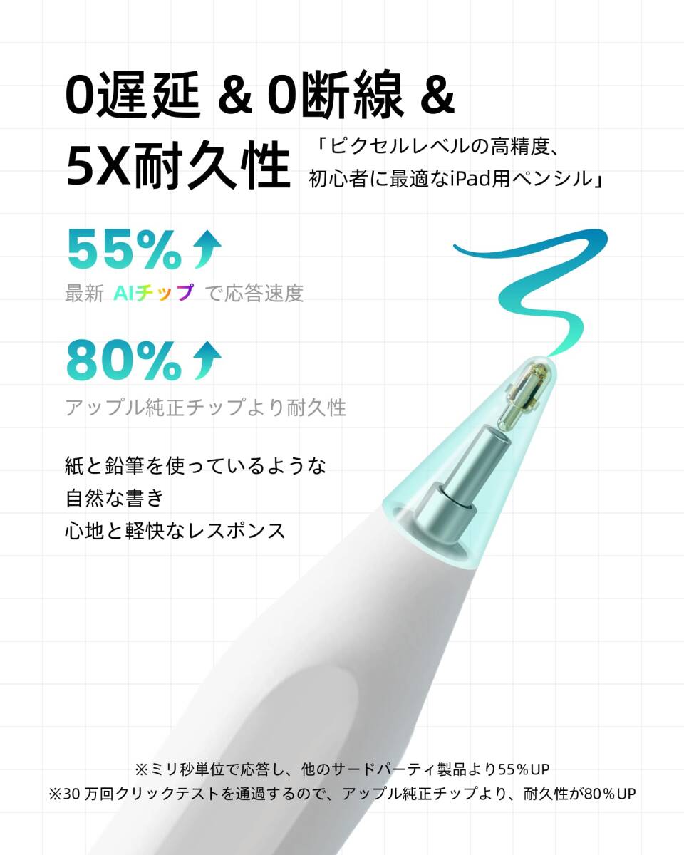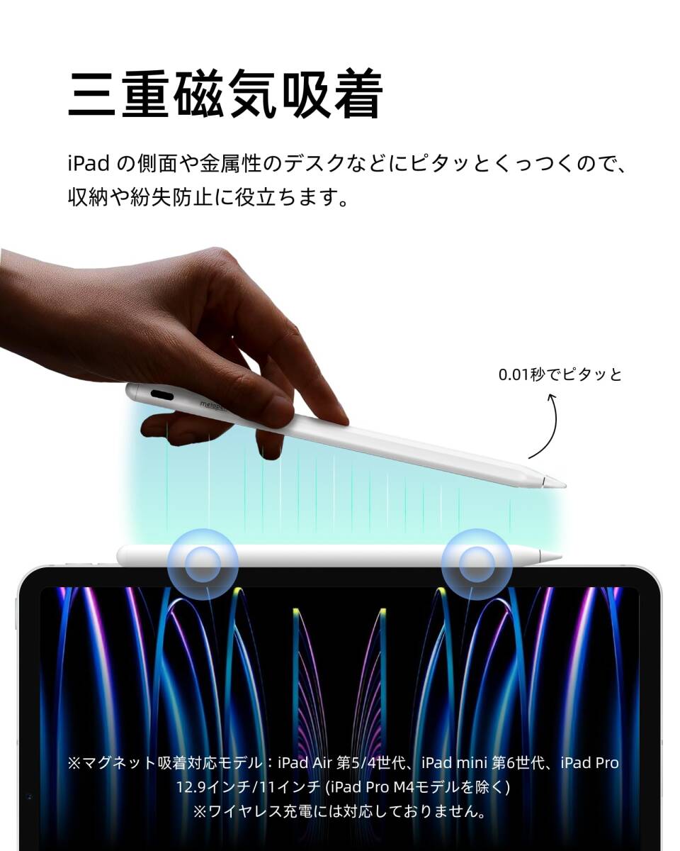 【使いやすさ& パームリジェクション& 磁気吸着機能】メタペン iPad ペン A8は、複雑なBluetoothペアリングが不要で、ペンの頭を2回タッチするだけで、すぐに使えます。パームリジェクション機能を搭載しており、デバイスの画面に手を置くことができ、長時間の作業でも腕が疲れません。磁気吸着機能があり、紛失を防ぎ、iPad側面にピタっとっついて収納・持ち運びに便利です。ご注意:磁気吸着機能対応: iPad Pro 12.9"、iPad Pro 11"、iPad Air 第4/5世代、iPad mini第6世代。磁気吸着機能非対応: iPad Pro 13/11 inch(M4)、iPad Air 13/11 inch(M2)、iPad第6/7/8/9/10世代、iPad Air第3世代、iPad Mini第5世代。