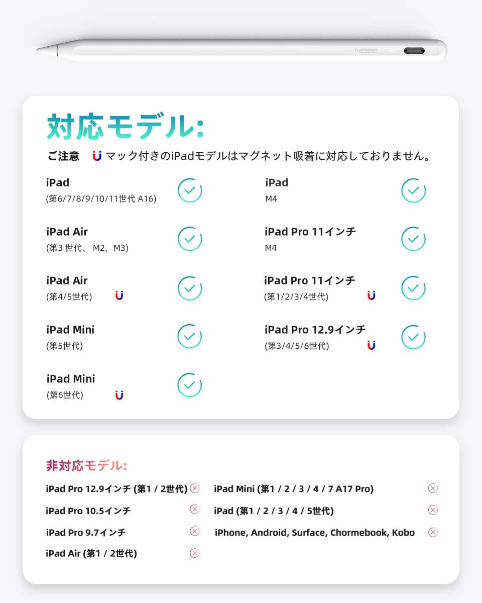 【2018年以降のiPad専用タッチペン】Metapen A8は、2018以降のiPadモデルに最適なコンパニオンです:iPad 第6/7/8/9/10/11世代、iPad Air 第3/4/5/6/7世代、iPad Pro 11インチ第1/2/3/4世代、iPad Pro 12.9インチ 第3/4/5/6世代、iPad Mini第5/6世代、 iPad Pro 13/11 inch(M4)、iPad Air 13/11 inch(M2)。アップルペンシルの最高な選択です。ご注文の前にデバイスを確認してください、他のモデルは無効です。