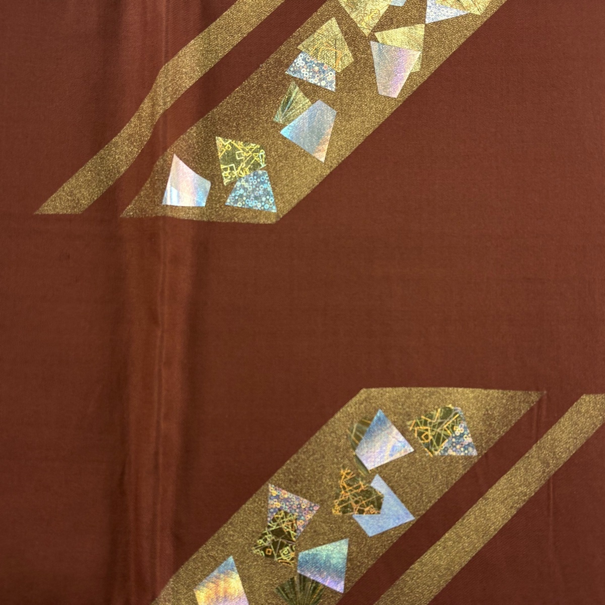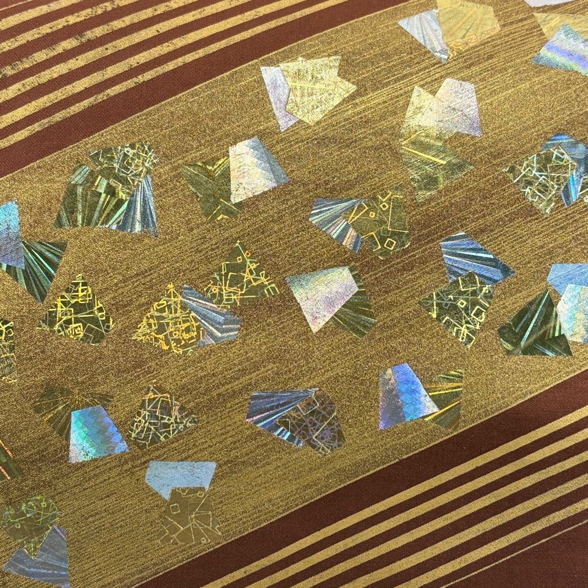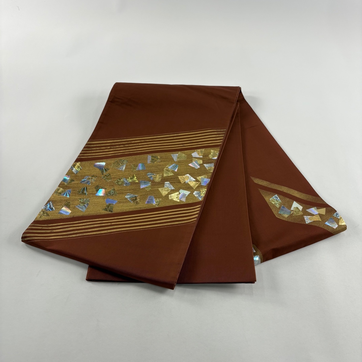 | 袋帯 秀品 幾何学模様 斜縞 金銀彩 茶色 お太鼓柄 正絹 【中古】 |