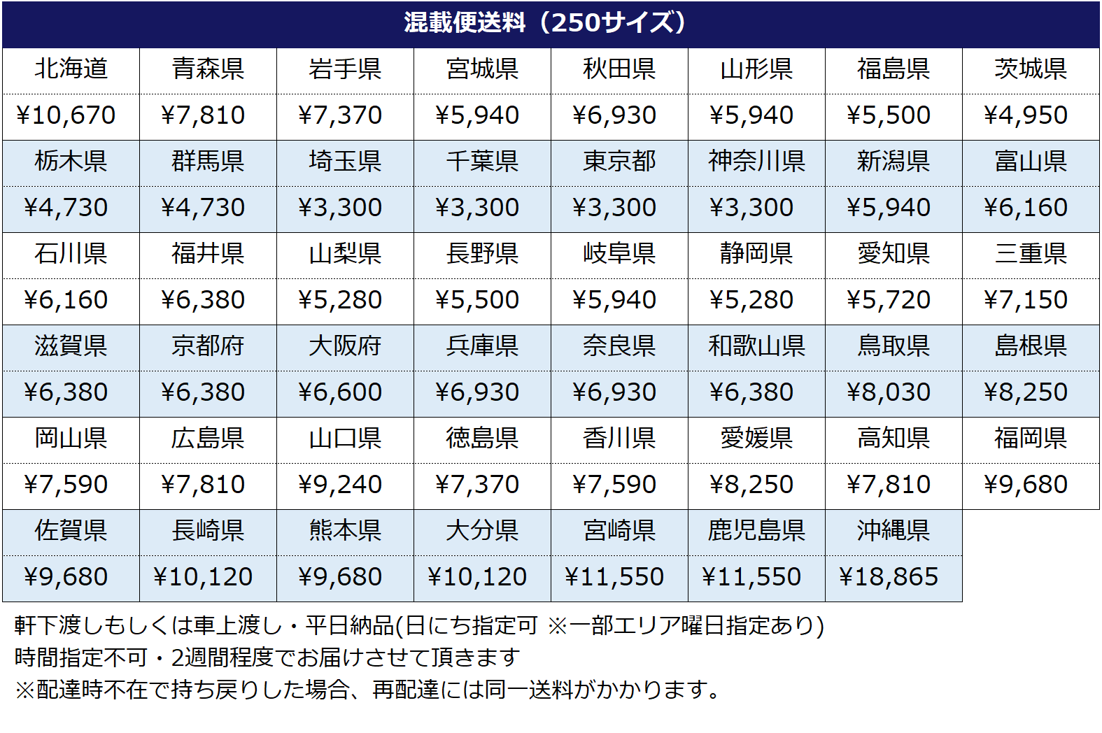 ※離島等の場合、配送可否含めて確認させていただきます。 ※同梱発送について… 同梱発送は、できる範囲で対応させて頂いております。 同梱したものが170サイズを超える荷物はそれ以外の混載便にて発送とさせて頂きます。 家具など大型商品は配送事故防止の為、同梱発送は行っておりません。 ※大量購入の場合、自社配送、トラックチャーター手配や搬入設置手配、耐震施工手配、養生手配などご相談ください。 |