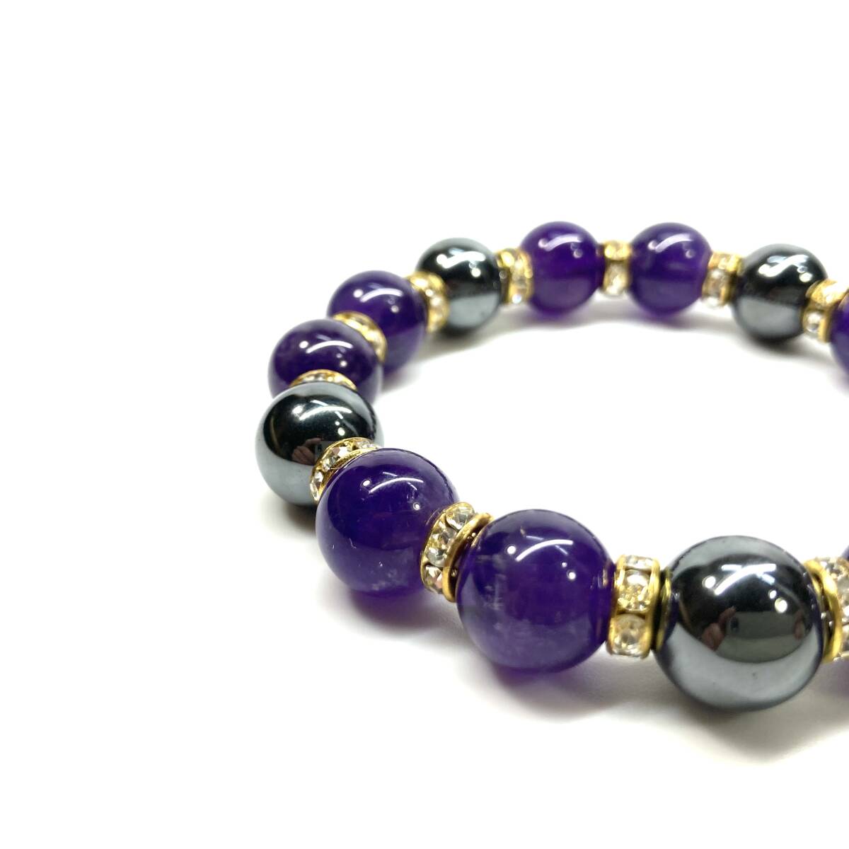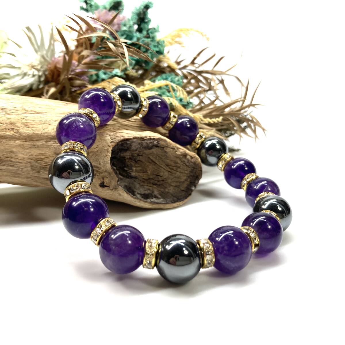 ヘマタイト&アメジスト パワーストーン ブレスレット 天然石ブレス (ゴールド) 12mm 金運 仕事運 メンズ・レディース 男性 女性