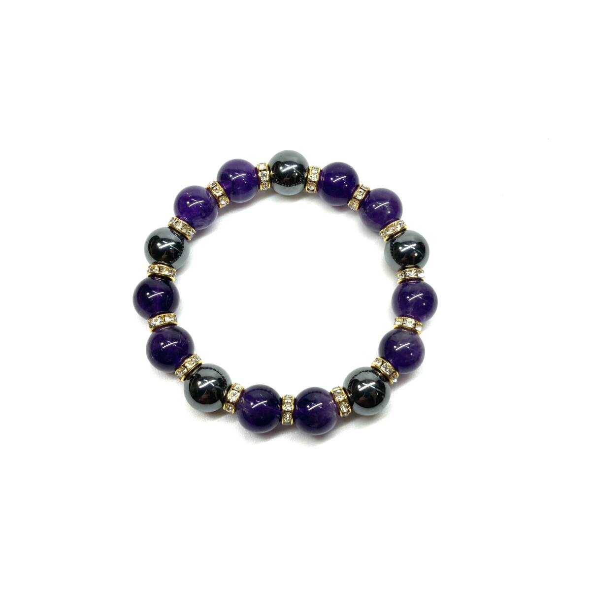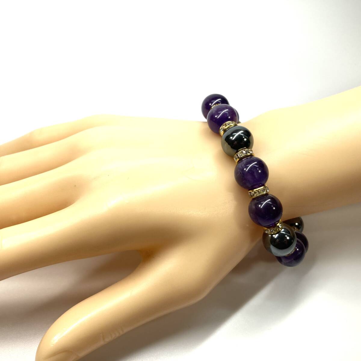 こちらは、ヘマタイトとアメジストを組み合わせたパワーストーンブレスレットです。間にはロンデルを挟み高級感あるデザインに仕上げております。石大きさは12mm玉を使用して内周約18cmです。気になる方は是非この機会にどうぞ。