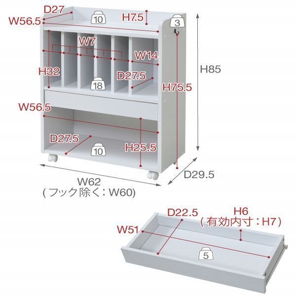 | 【カラー】 ナチュラル、ホワイト 【サイズ】 <外寸> 幅62×奥行29.5×高さ85cm <内寸> 上段オープン部:幅56.5×奥行27×高さ7.5cm 整理棚各部:幅7×奥行27.5×高さ32cm 整理棚右端:幅14×奥行27.5×高さ32cm 下段オープン部:幅56.5×奥行27.5×高さ25.5cm 引き出し:幅51×奥行22.5×高さ6(有効7)cm フック:出幅2cm フック下:高さ75.5cm 【材質】 本体:プリント紙化粧合板 【耐荷重】 天板:10kg以下 整理棚:18kg以下 引き出し;5kg以下 オープン部:10kg以下 フック:3kg以下 【生産国】 ベトナム 【梱包】 サイズ:90×41.5×14cm、重量:16.7kg 【その他】 ・背面化粧有り ・キャスター4個(うち2個ストッパー付き) ・フック2個付き 【組み立て品】 お客様による組み立てが必要です。 【ご注意】 ・サイズ、重量は概算です。 ・商品カラーはご使用のモニターによって実際の明るさや色と異なって見える場合がございます。 |