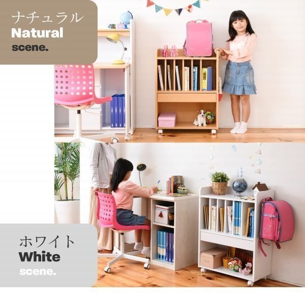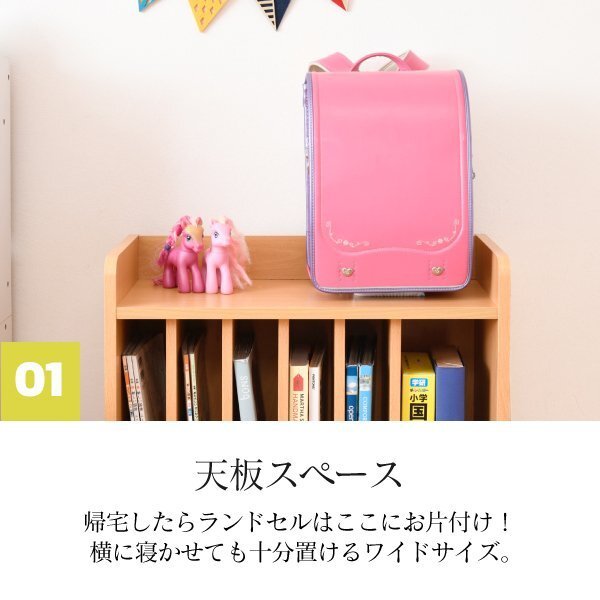 | 「リビング学習」にぴったりなキャスター付きのランドセルラックです。 真ん中の仕切り棚は6つに仕切られているので曜日や科目に合わせて収納できます。 幅の広い右側は辞書などの収納に。 真ん中の引出しはペンケース等や、学校から配られるプリント類に便利です。 本体横は左右どちらにもフックの取り付けが可能です。 |