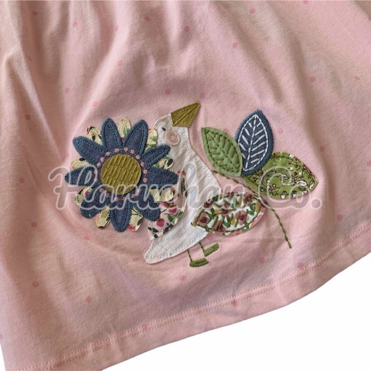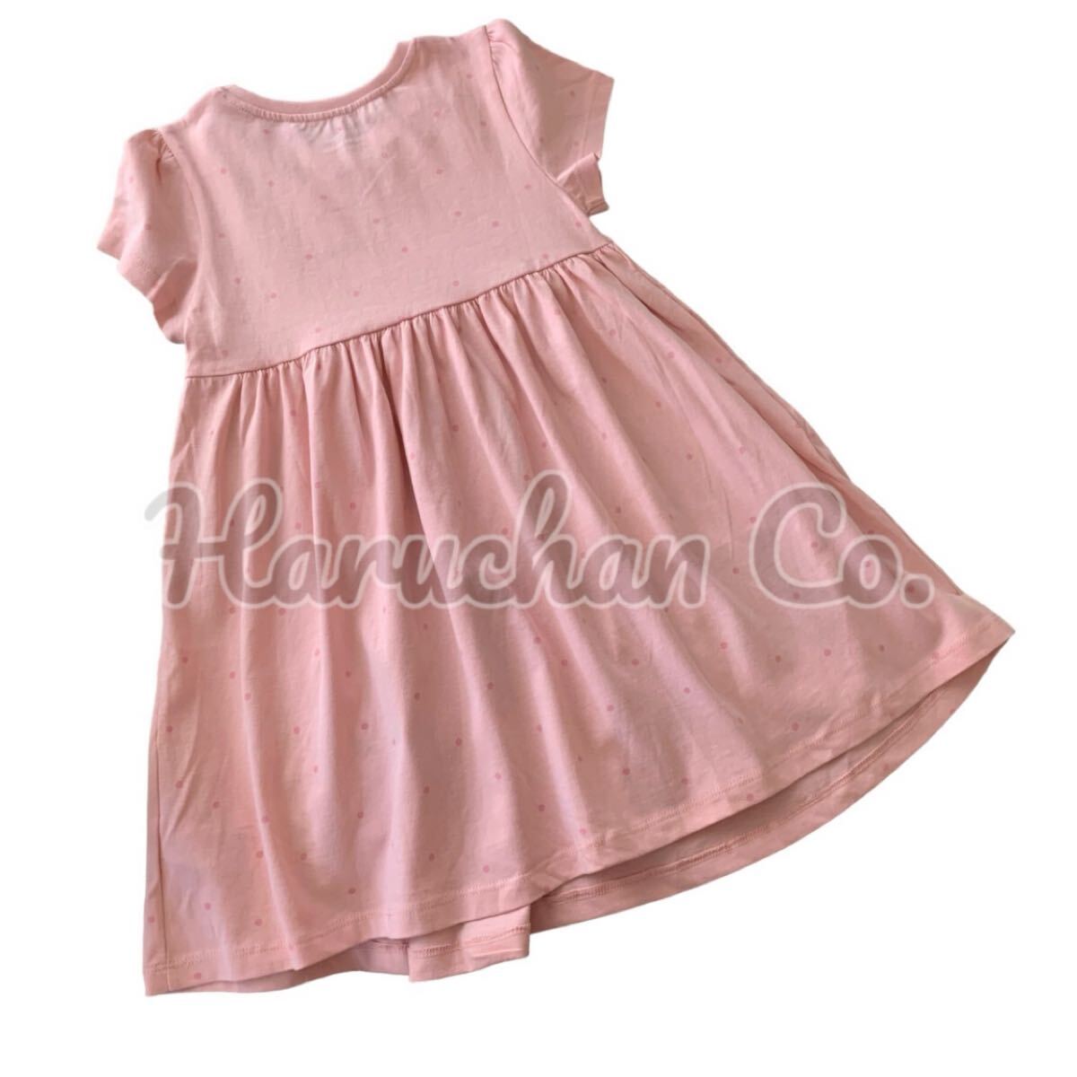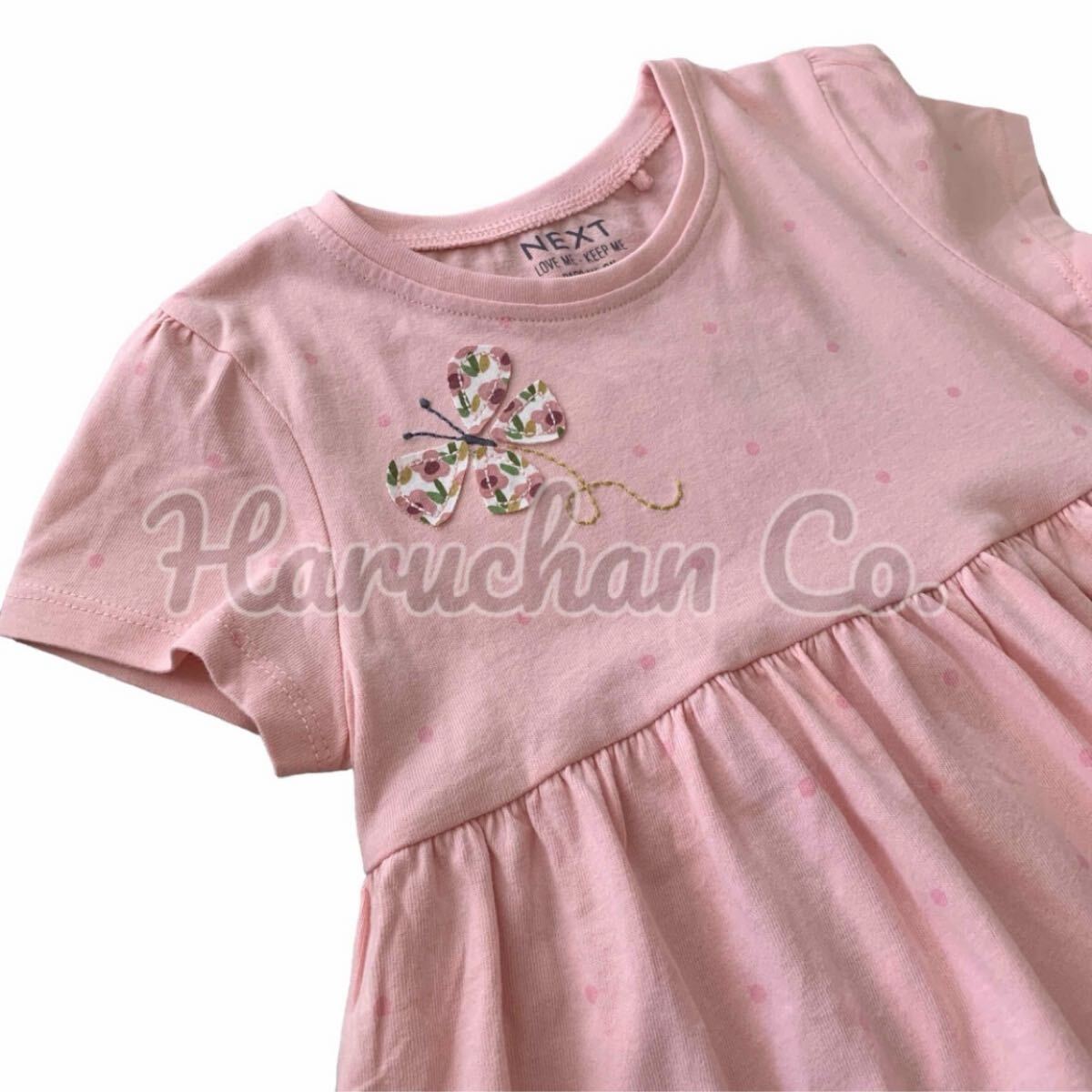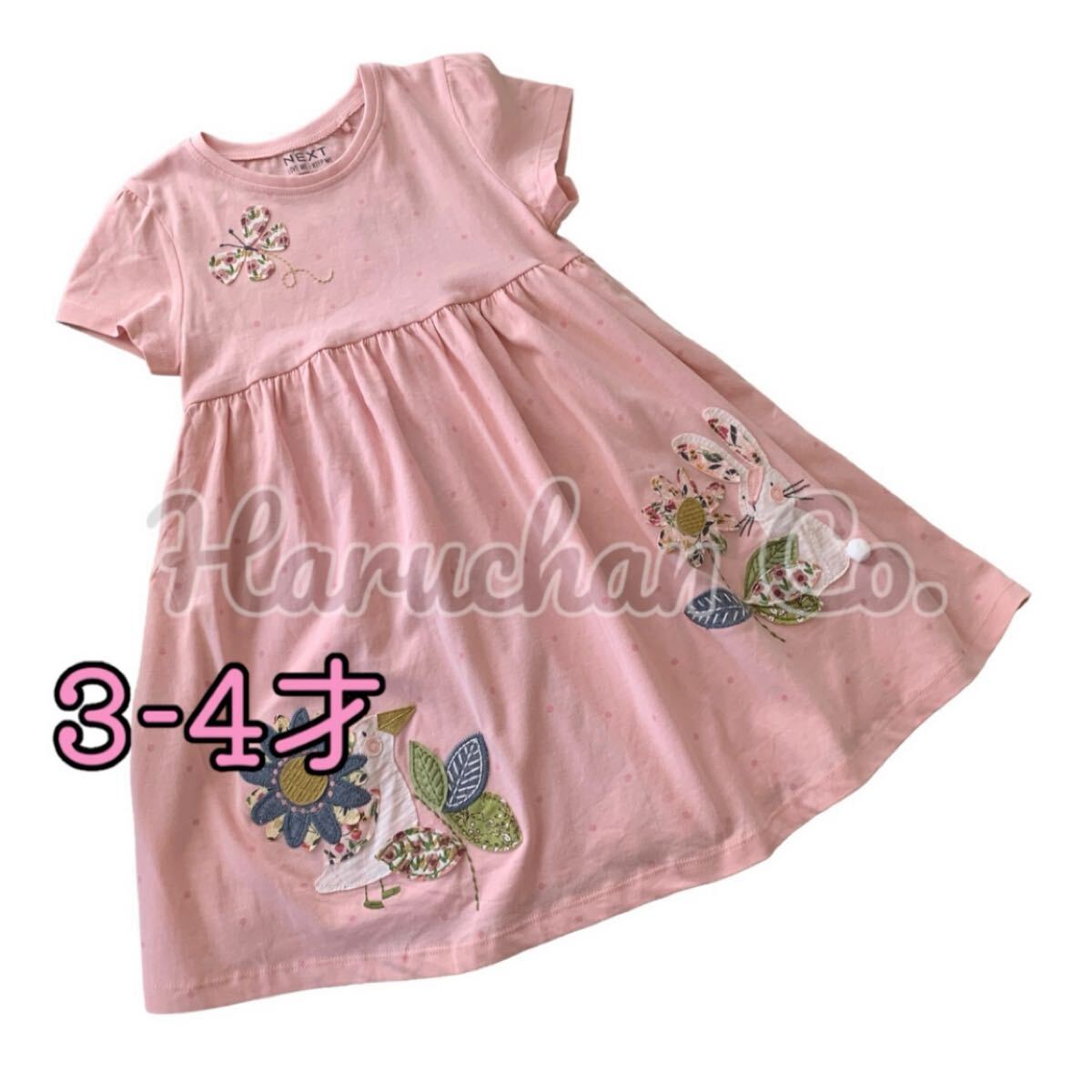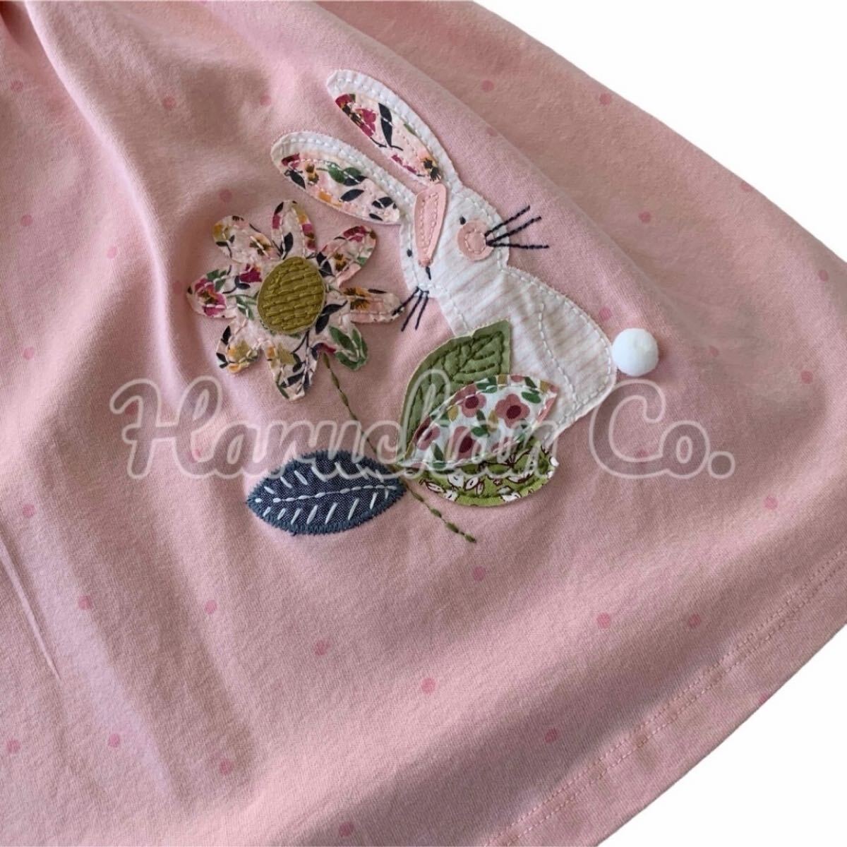 ピンクのドット柄の生地にうさぎ、ちょうちょなどのワッペンや刺繍がかわいいワンピース