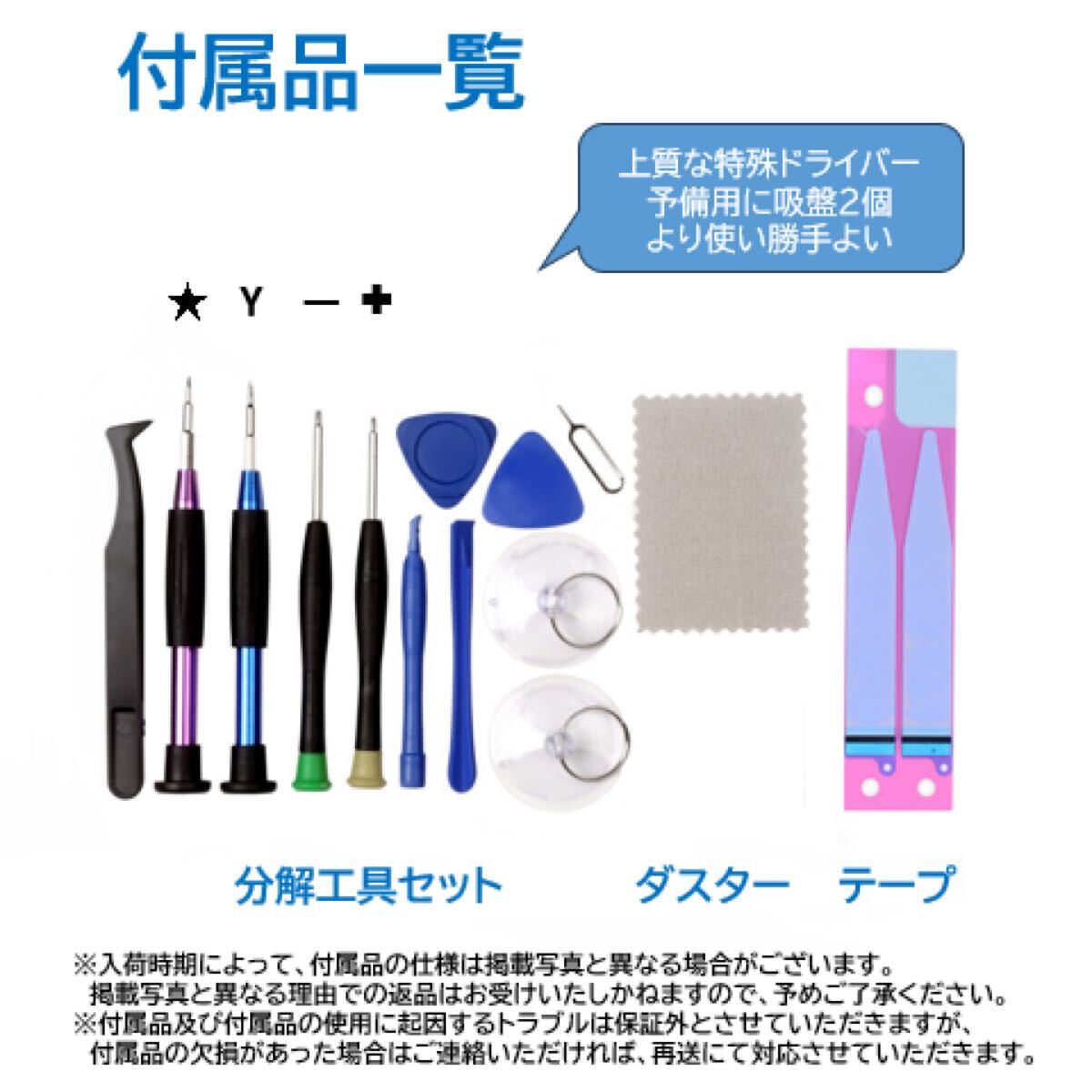 分解工具や両面テープも付属しており、古くなったバッテリーをご自身で交換したい方向けのリペアキットです。