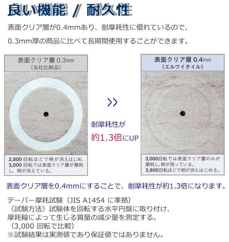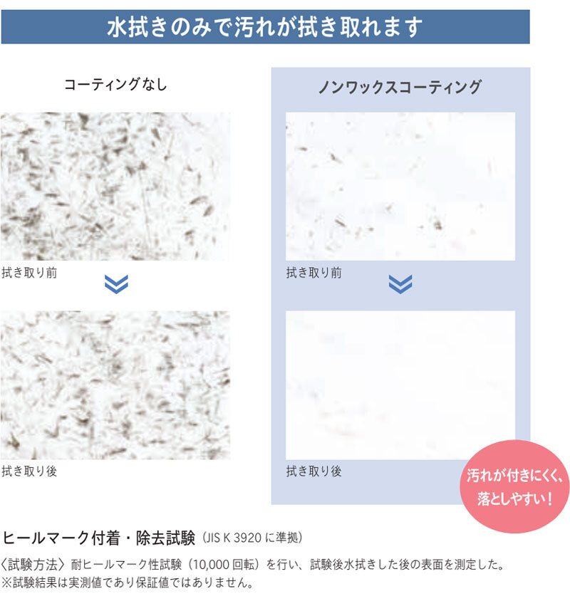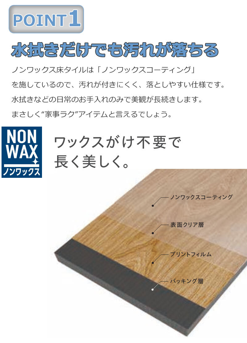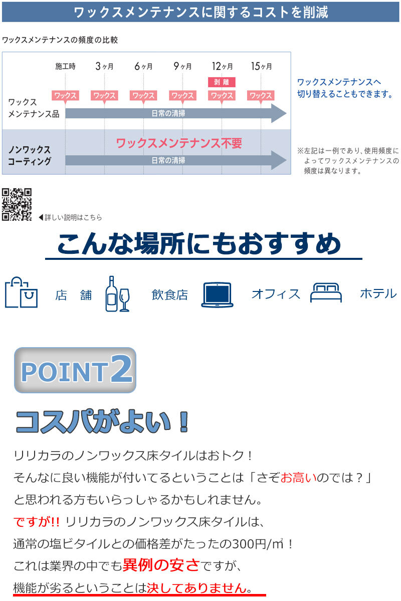 「メラミンタイル」と新商品の「ノンワックスビニル床タイル」はワックスがけのコストや時間を大幅に削減できます。