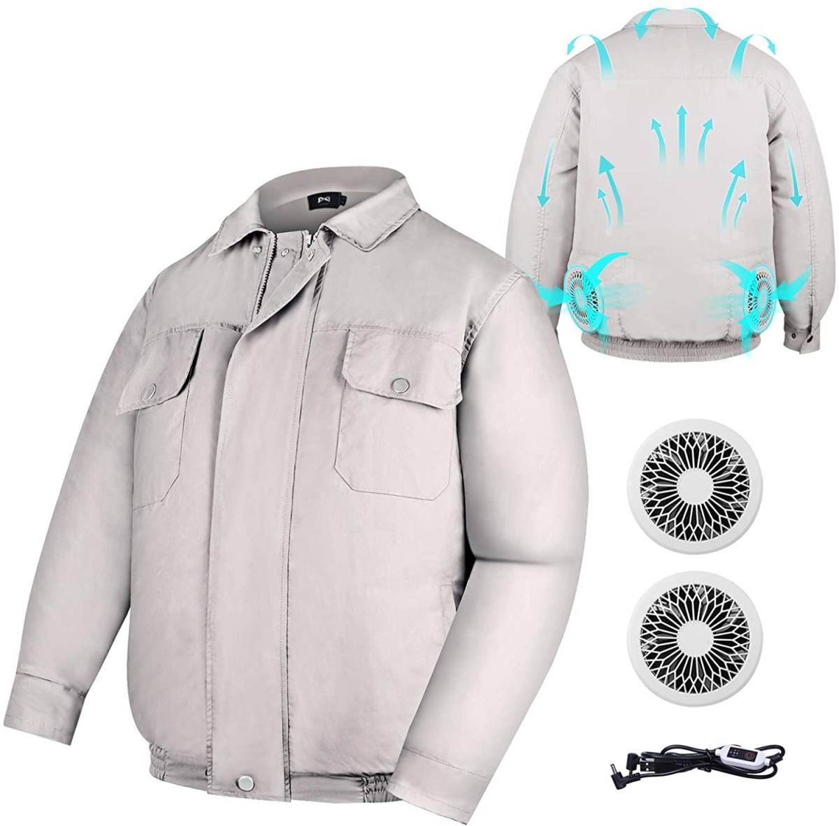 空調作業服 熱中症対策 扇風機 長袖 薄手 UVカット 吸汗速干 低騒音 超軽量 強い動力 紫外線対策 USBケーブル 現場工事-グレー