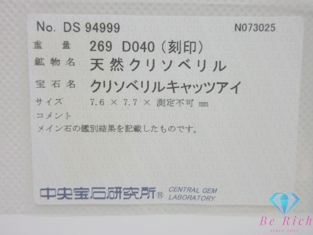 | 重量 | 総重量:約7.52g 【使用石】(カラット/刻印) クリソベリルキャッツアイ:2.69ct / 269 ダイヤモンド:0.40ct / D040 | ||||