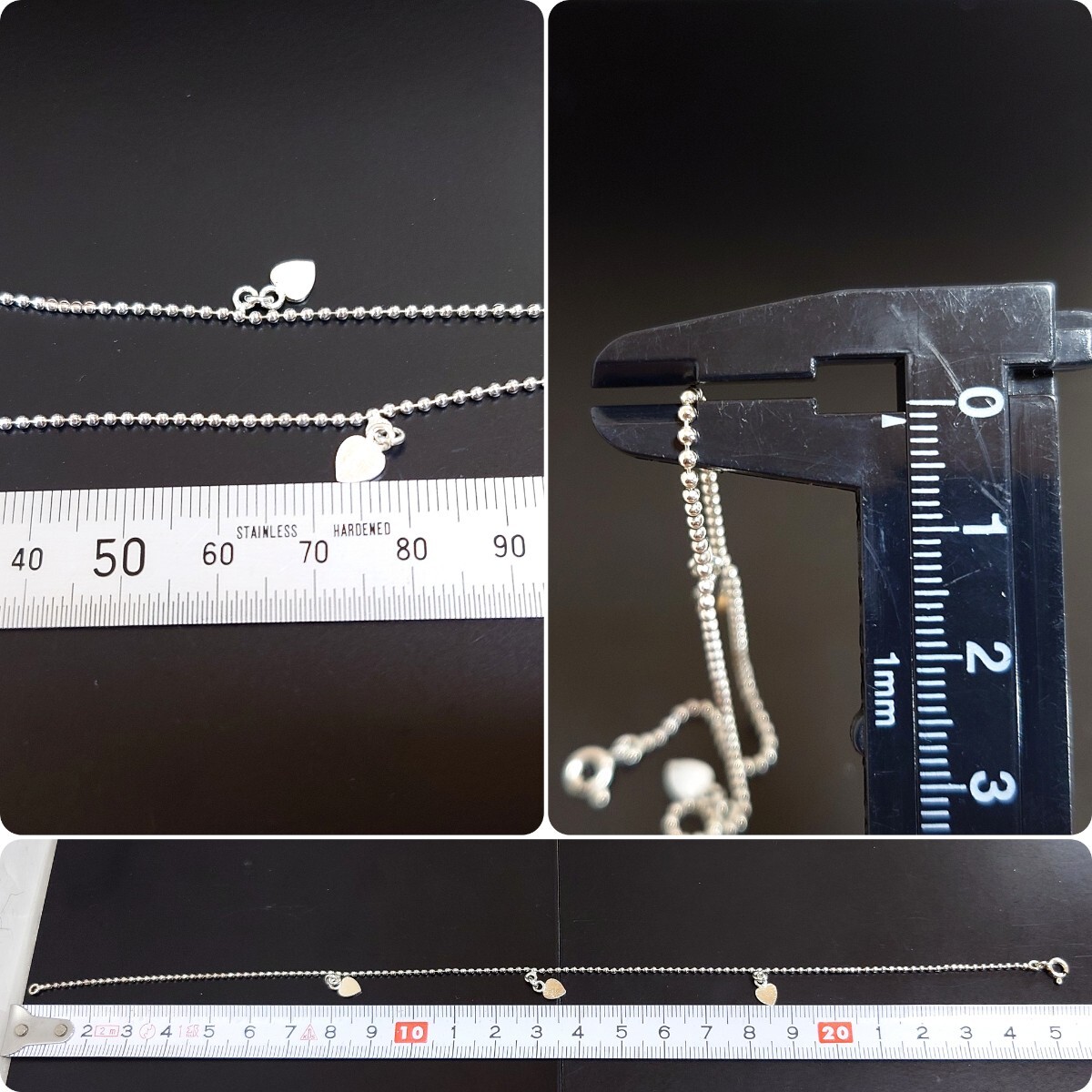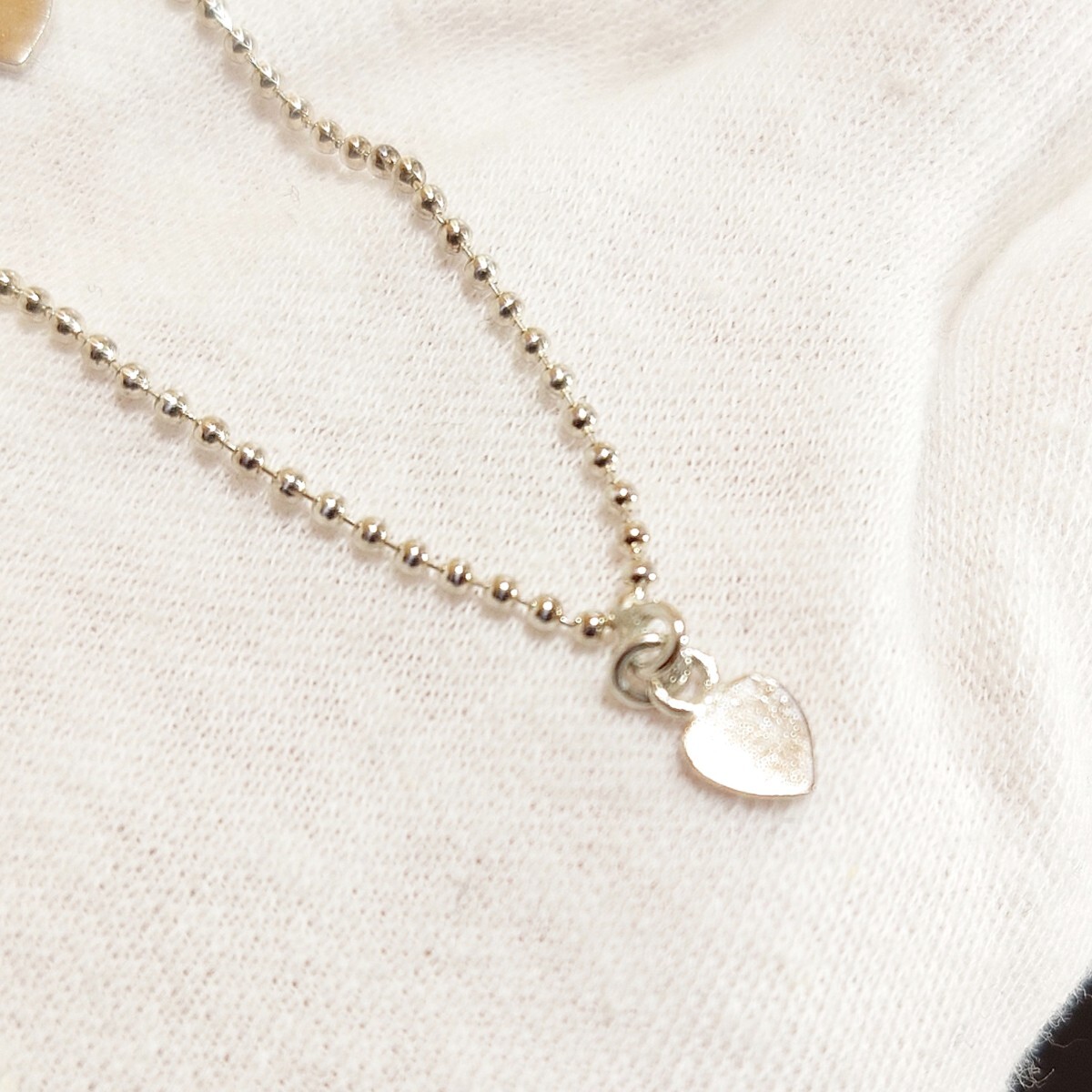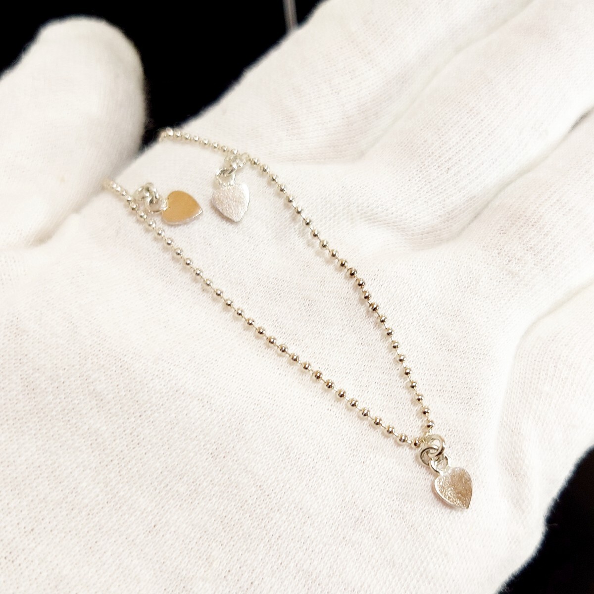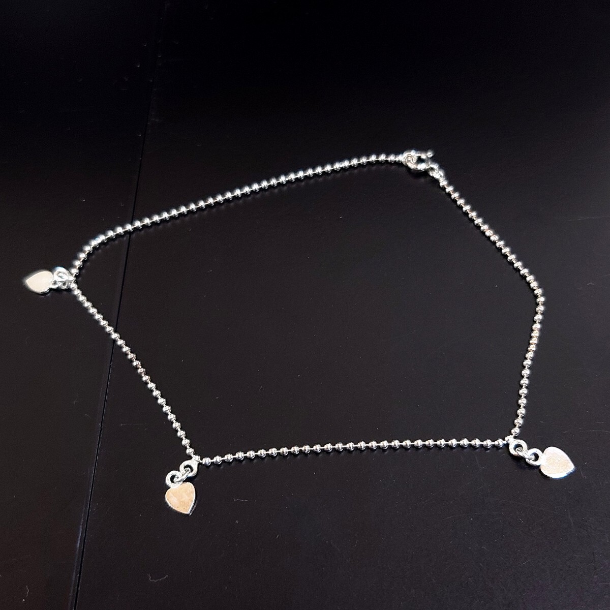 小さくて薄いハートのチャームが3個ついていて光の反射でキラキラ輝きます☆