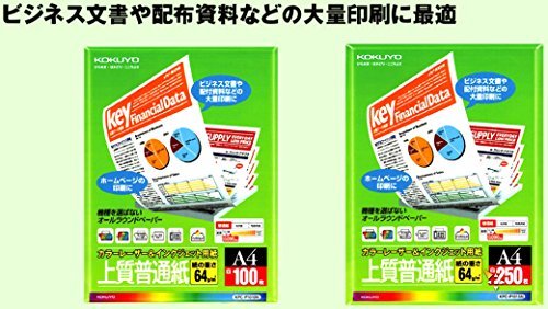64g/m2・・PatternName:単品・坪量:64g/m2 / 紙厚: 0.09mm / 総枚数: 250枚・片面印刷用紙●お求めやすい多枚数パックのカラーレーザープリンタ・インクジェットプリンタ用紙です。 ●ネットでの検索文書やホームページの出力など、さまざまなシーンで幅広くお使いいただけます。 ●用紙の表裏はありませんが、インクジェットプリンタで両面印刷する場合は裏面の印刷が透け、波打ち・にじみが生じます。高品位のカラー出力をする場合はインクジェット専用紙をお使いください。